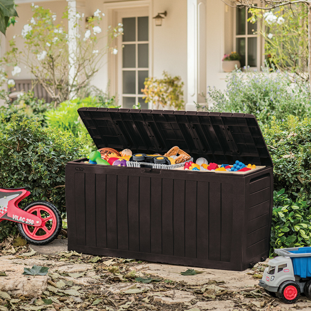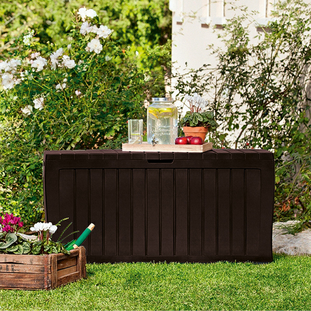 Depozitare practică pentru pernele de grădină. Cutia de depozitare Marvel este un model din colecția Classic, fabricată de marca Keter. Lada are o capacitate de 270 de litri, ceea ce îi permite să încapă numeroase articole de grădină. Perfect pentru depozitarea pernelor de grădină, uneltelor, jucăriilor și a altor echipamente. Datorită mânerelor și roților încorporate, cutia poate fi mutată cu ușurință în orice locație.