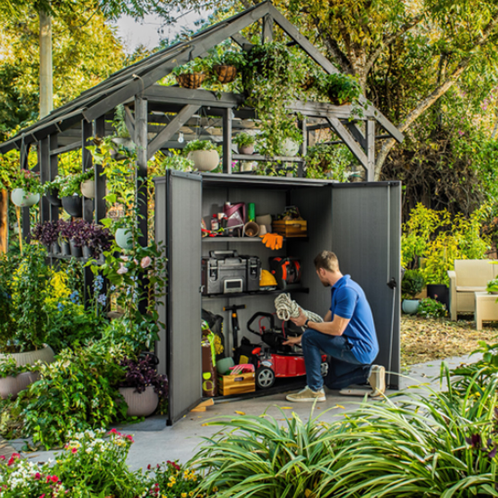 Spațiul mare de depozitare al Cortinei Alto este ideal pentru depozitarea echipamentelor de grădină, cum ar fi mașinile de tuns iarba, mobilierul de grădină sau echipamentul sportiv. Designul interior spațios asigură spațiu pentru toate uneltele de grădinărit.