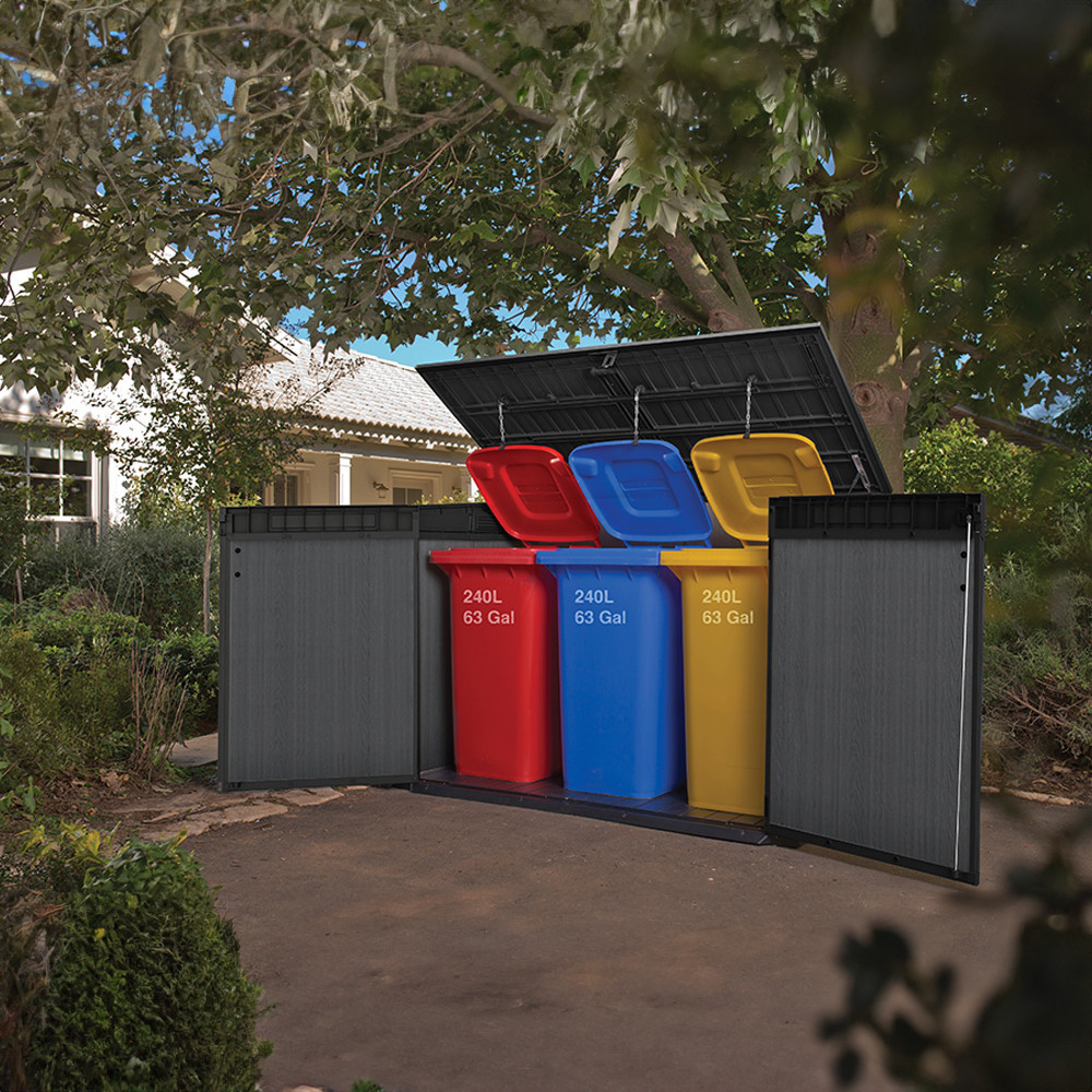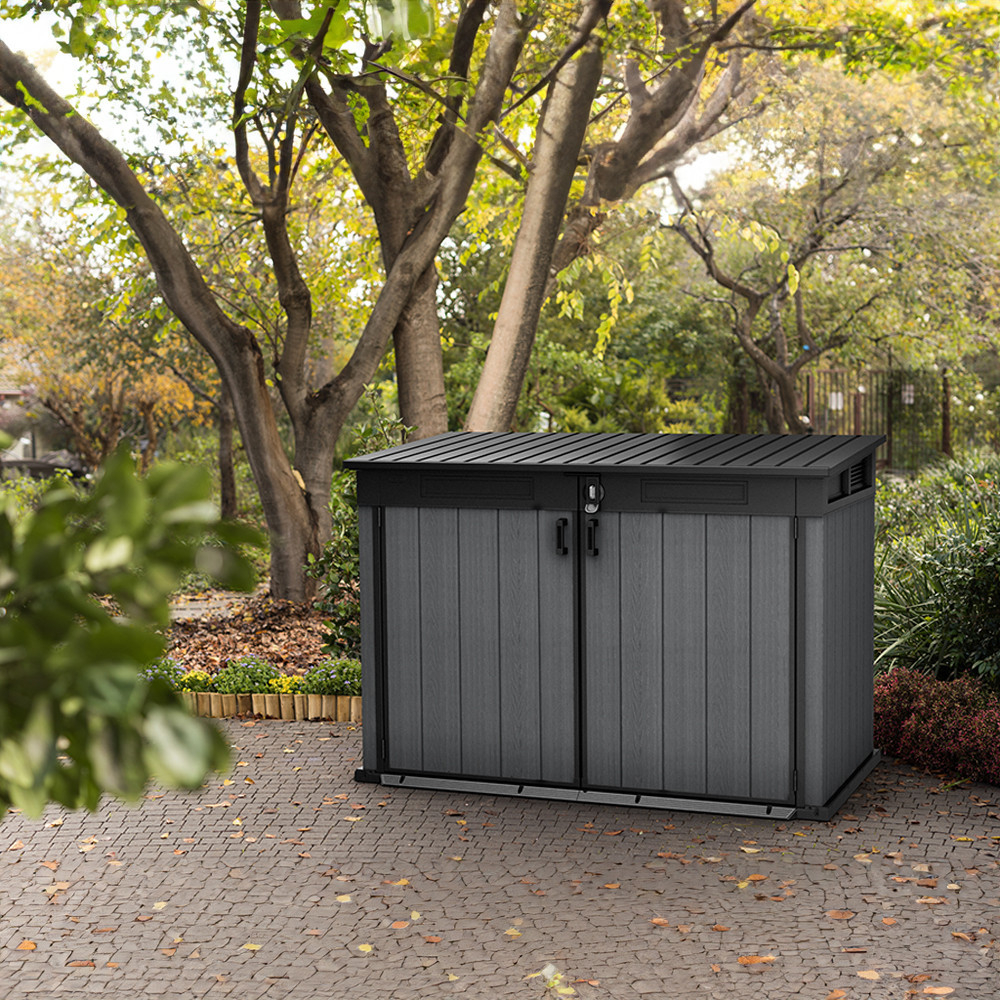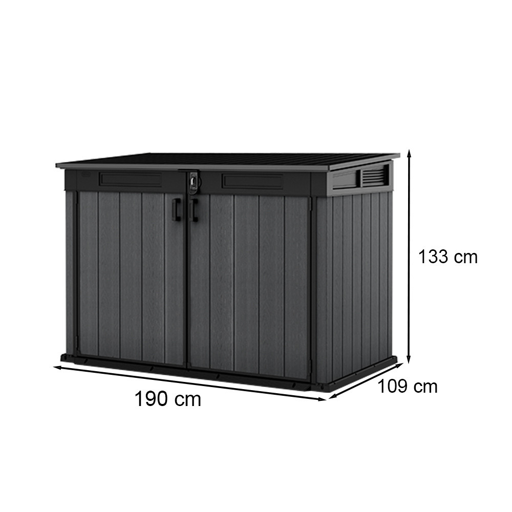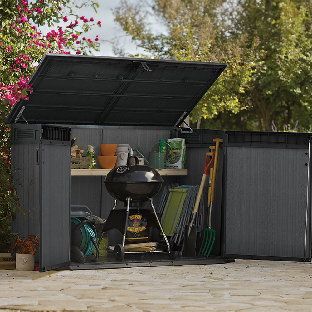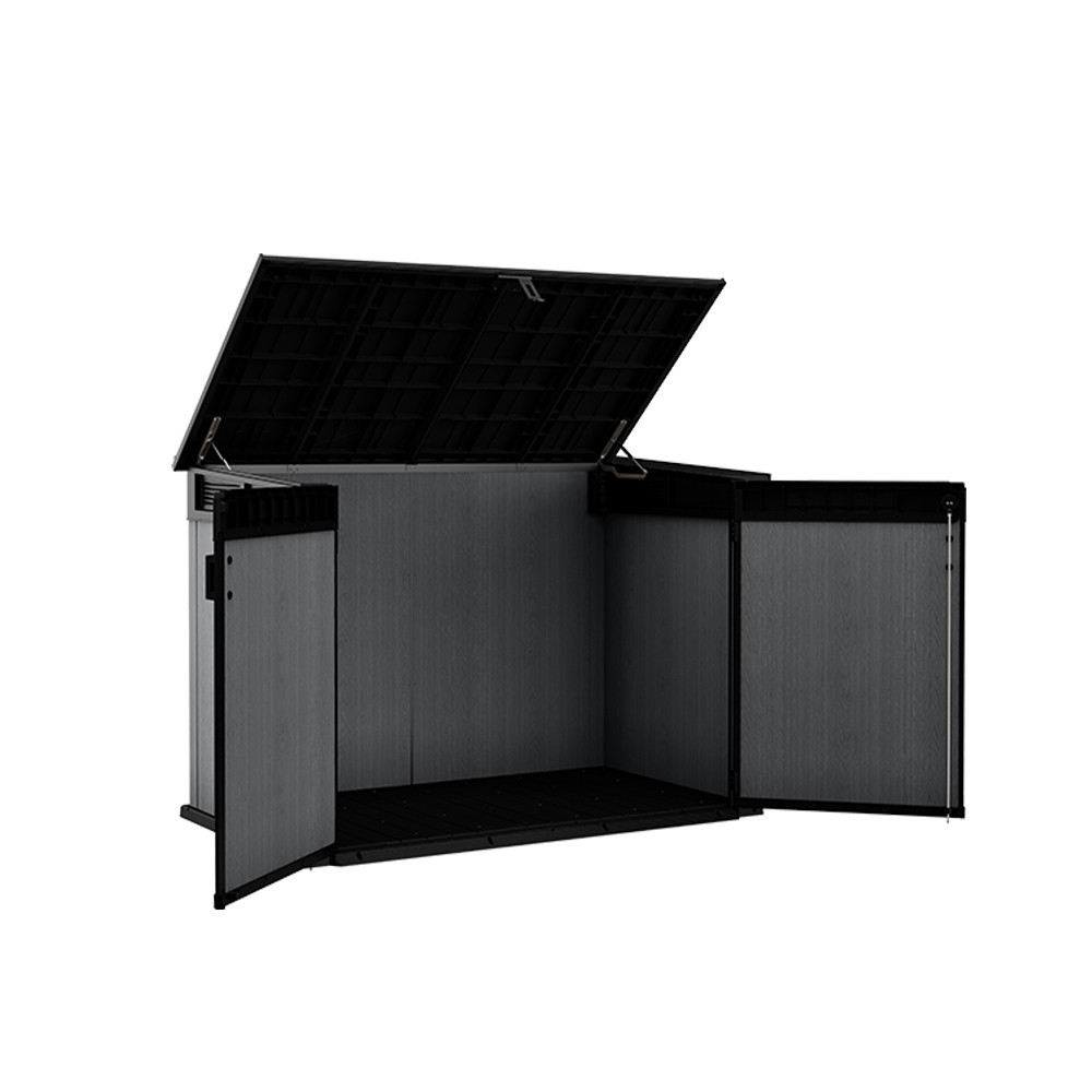 Partea superioară cu deschidere a unității de depozitare nu numai că oferă acces mai ușor, dar vă permite și să depozitați obiecte mai mari, cum ar fi un grătar de grădină sau o bicicletă. Această caracteristică sporește versatilitatea și caracterul practic al unității de depozitare.