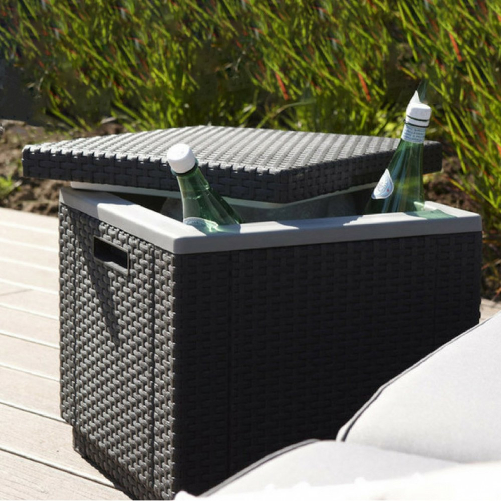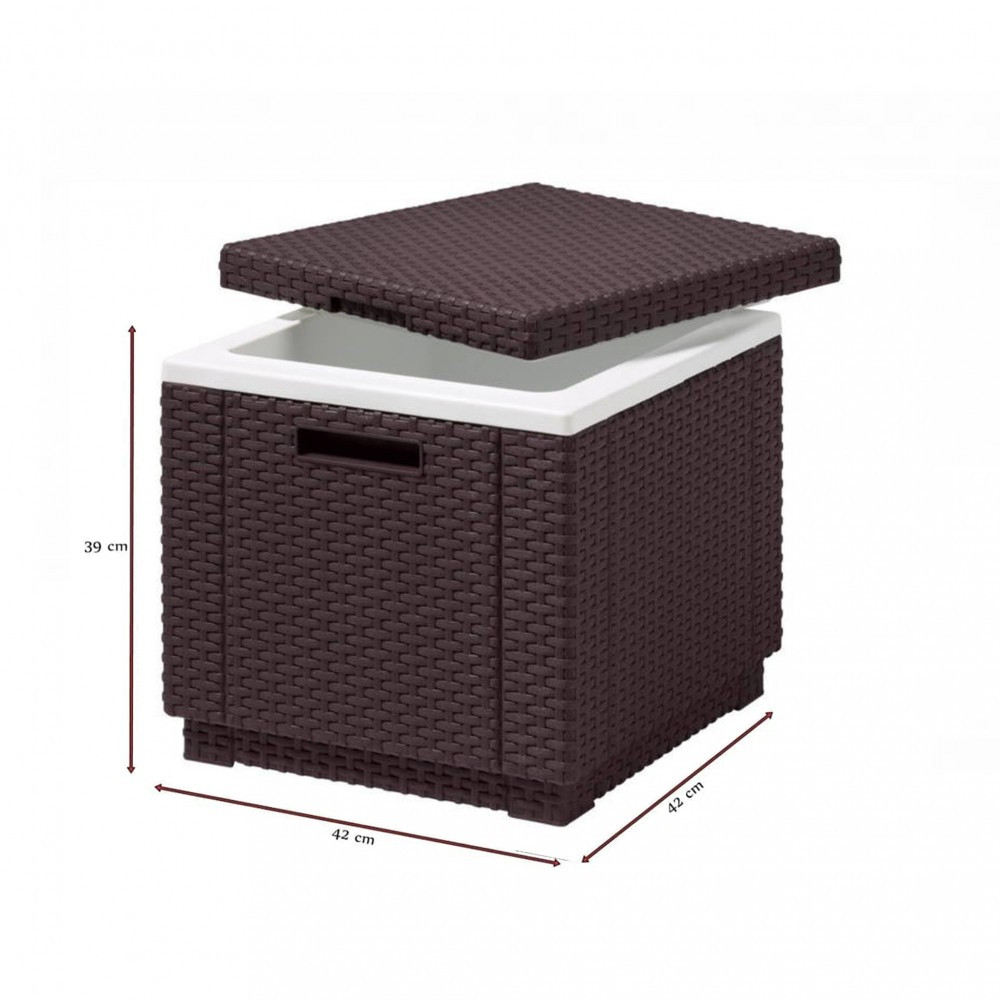 Lada frigorifică Keri (în loc de geantă frigorifică) Ice Cube este o ladă frigorifică Keri cu design unic, care ajută la menținerea băuturilor reci în timpul petrecerilor de vară! Răcitorul vine cu o cantitate minimă de pachete de gheață, dar merită să adăugați o pungă de gheață pentru a asigura o performanță adecvată de răcire. Poate fi folosit și ca scaun. Datorită designului său, recipientul pentru depozitarea și răcirea băuturilor oferă un scaun solid, dar moale, pentru o persoană care poate sta pe el și își poate monitoriza consumul de băuturi, dar poate fi folosit și ca masă și suport pentru picioare, în funcție de nivelul de iluminare. Ice Cube ca spațiu de depozitare în grădină din ratan. Desigur, îl putem folosi și în moduri alternative, adică putem depozita nu doar băuturi, ci orice altceva în el. Mobila este fabricată din plastic rezistent la umezeală și radiații UV.