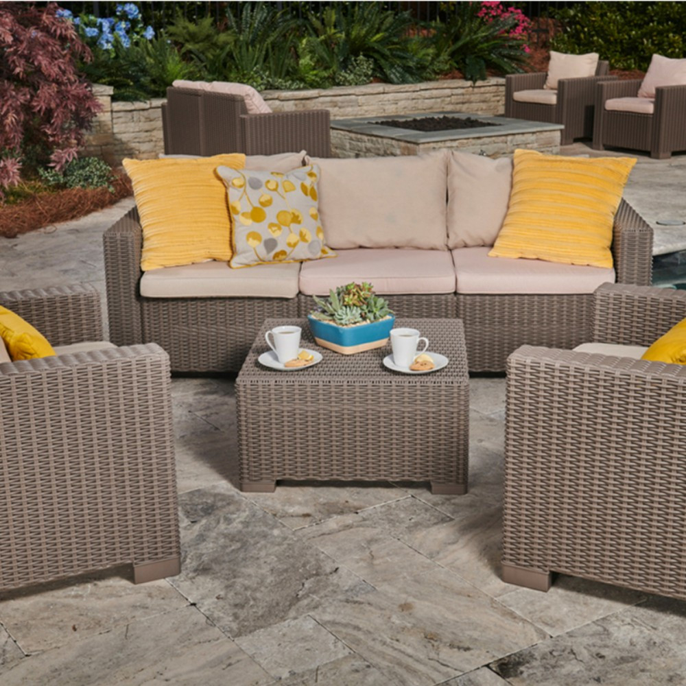 Masa în culoarea cappuccino a fost realizată de marca Allibert, care aparține unui grup cunoscut (alături de Curver și Keter) care produce mobilă din plastic turnat prin injecție. Această piesă de mobilier amintește vizual de mesele din technoratan, deși este de fapt fabricată din polipropilenă. Acest material se caracterizează printr-o rezistență excelentă la condițiile meteorologice schimbătoare, la lumina soarelui și la diferențele de temperatură, datorită căreia masa este disponibilă pe tot parcursul anului. În practică, asta înseamnă că poate fi lăsat afară tot timpul anului fără a-și pierde aspectul original. Mobila nu necesită întreținere, chiar și cea mai persistentă murdărie poate fi îndepărtată cu apă îmbogățită cu un detergent blând.