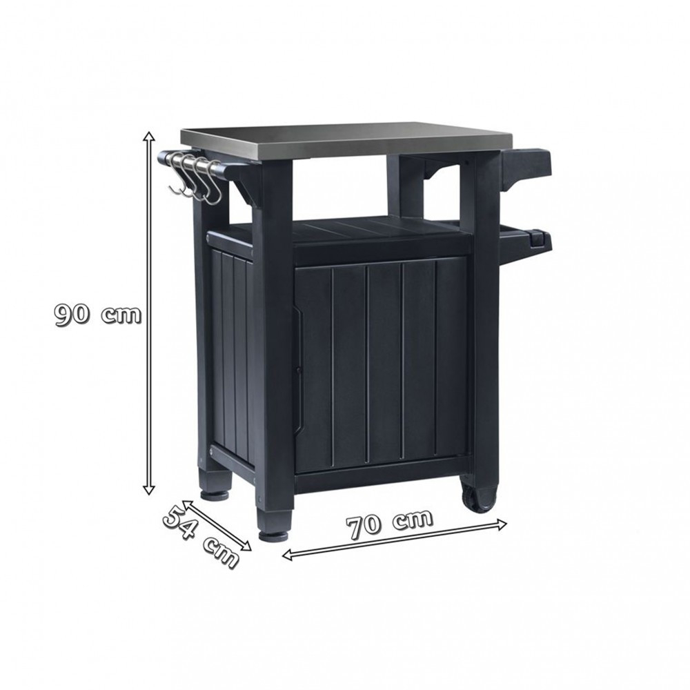 În plus, este echipat cu un mâner practic pe care puteți agăța accesoriile pe care le utilizați în prezent - mănuși de protecție, o cârpă sau un clește de grătar. În partea de jos a mobilei există un dulap spațios pentru tot felul de lucruri mărunte de care ați putea avea nevoie atunci când faceți grătar. Poate fi folosit pentru diverse produse și accesorii pentru grătar, cum ar fi o pungă de cărbune de rezervă.