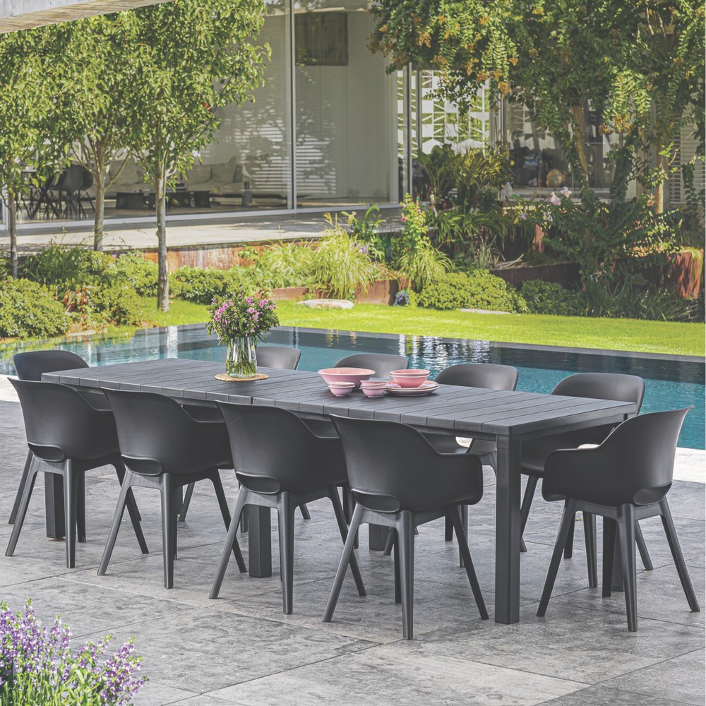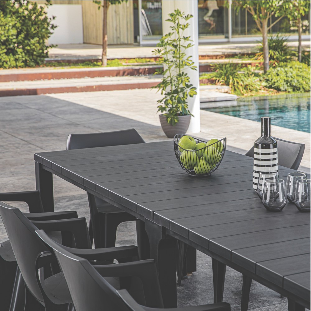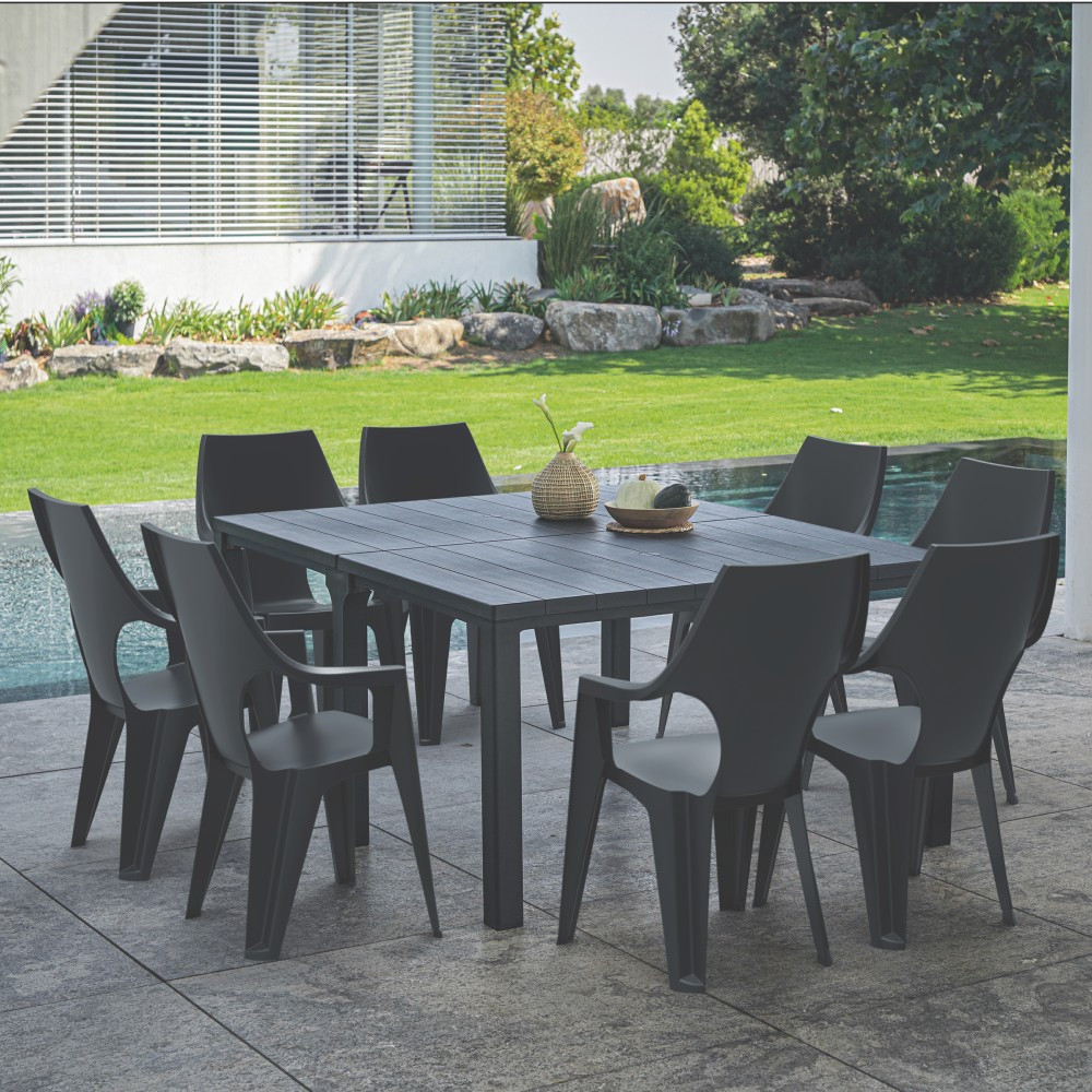 Masa dublă de grădină din plastic Julie este soluția perfectă dacă organizați ocazional reuniuni mai mari de familie sau prieteni pe terasă sau în grădină și trebuie să oferiți spațiu pentru mulți oaspeți. Este o alternativă excelentă la produsele din ratan sintetic disponibile pe piață. Masa de grădină prezentată se distinge de variantele sale prin faptul că poate fi creată în 3 configurații - mese conectate prin laturi mai lungi, mese conectate prin laturi mai scurte și o versiune de masă pentru utilizare zilnică.