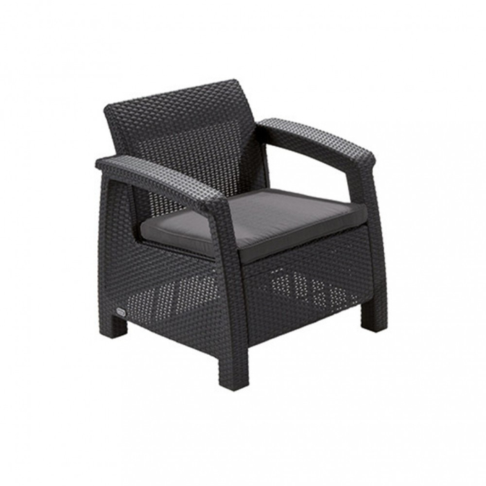 Fotoliul Corfu este confortabil, durabil și foarte elegant. Mobilierul este fabricat dintr-un plastic de înaltă calitate care imită technoratanul. Picioarele elegante și joase și husele pernelor subliniază estetica scaunelor. Cotierele late și practice, spătarul înalt (40 cm) și profilat, precum și pernele plate ajustate la dimensiunea șezutului (grosime de aprox. 6 cm) fac ca fotoliile Corfu II să fie extrem de confortabile. Stabilitatea lor ridicată permite o odihnă liniștită.