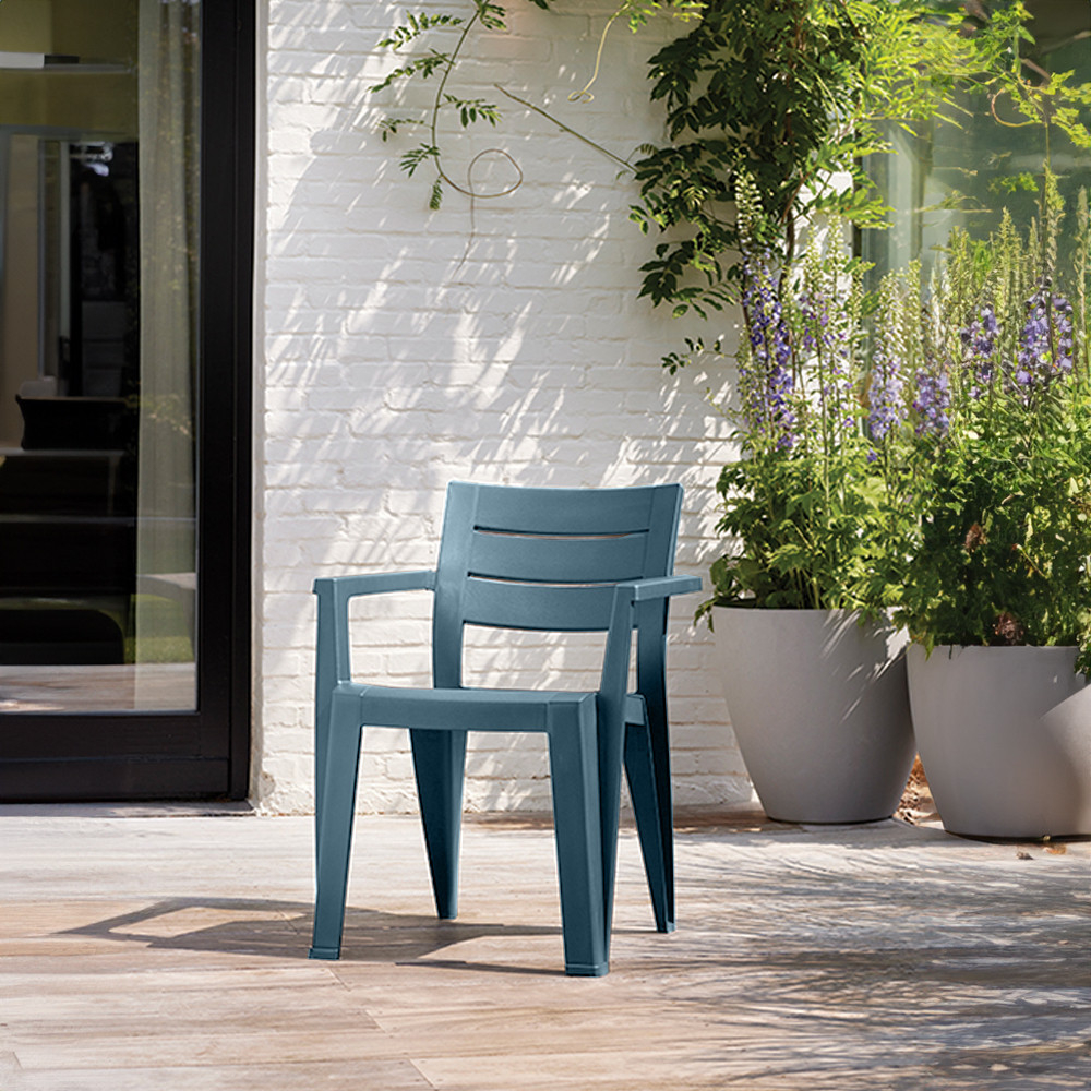 Alegeți scaunul de grădină din plastic cu cotiere Julie dacă sunteți în căutarea unui mobilier de exterior ușor de utilizat, care economisește spațiu, este rezistent la intemperii și reprezintă un plus confortabil pentru întâlnirile din grădină sau după-amiezile liniștite.