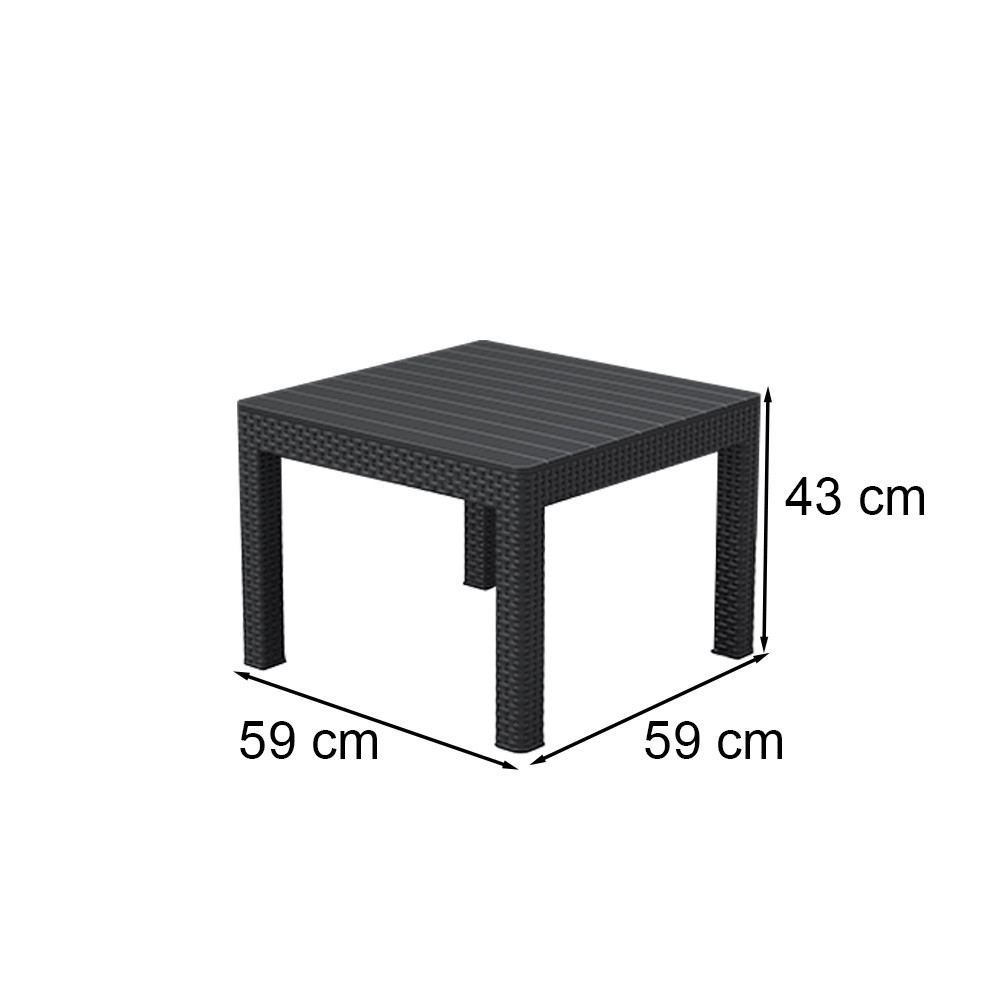 Acest set de mobilier de grădină cu efect de ratan de culoarea grafit include o canapea de colț și o masă, fabricate din plastic rezistent la intemperii, așa că nu trebuie să vă faceți griji cu privire la efectele radiațiilor UV. Setul de colț are dimensiunile de 73 cm x 172 cm. Înălțimea mesei: 43 cm, lățimea: 59 cm, lungimea: 59 cm.