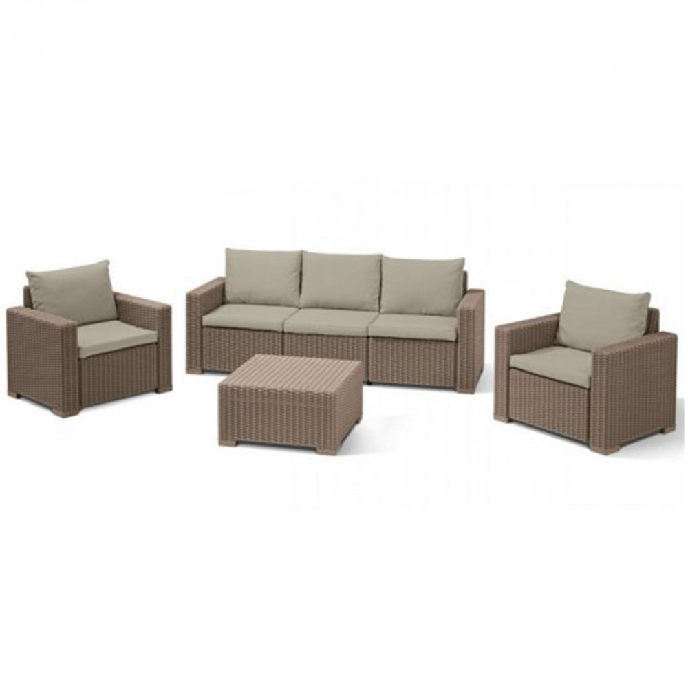 Setul de cappuccino și pernele atașate la acesta sunt de culoarea nisipului. Aceste culori se armonizează perfect cu grădina și mediul înconjurător al casei. Sunt disponibile și două variante de culoare mai închisă. Fiecare articol din set este așezat pe piciorușe mici, estetice, care le ridică ușor. Setul California 3 poate fi folosit acasă, în grădină, pe terasă sau pe balconul mai mare. Setul este rezistent la condiții meteorologice nefavorabile - ploaie, zăpadă și radiații UV. Fețele de pernă sunt, de asemenea, impregnate special. Totuși, în caz de ploi abundente, este mai bine să le ascundeți sub acoperiș.