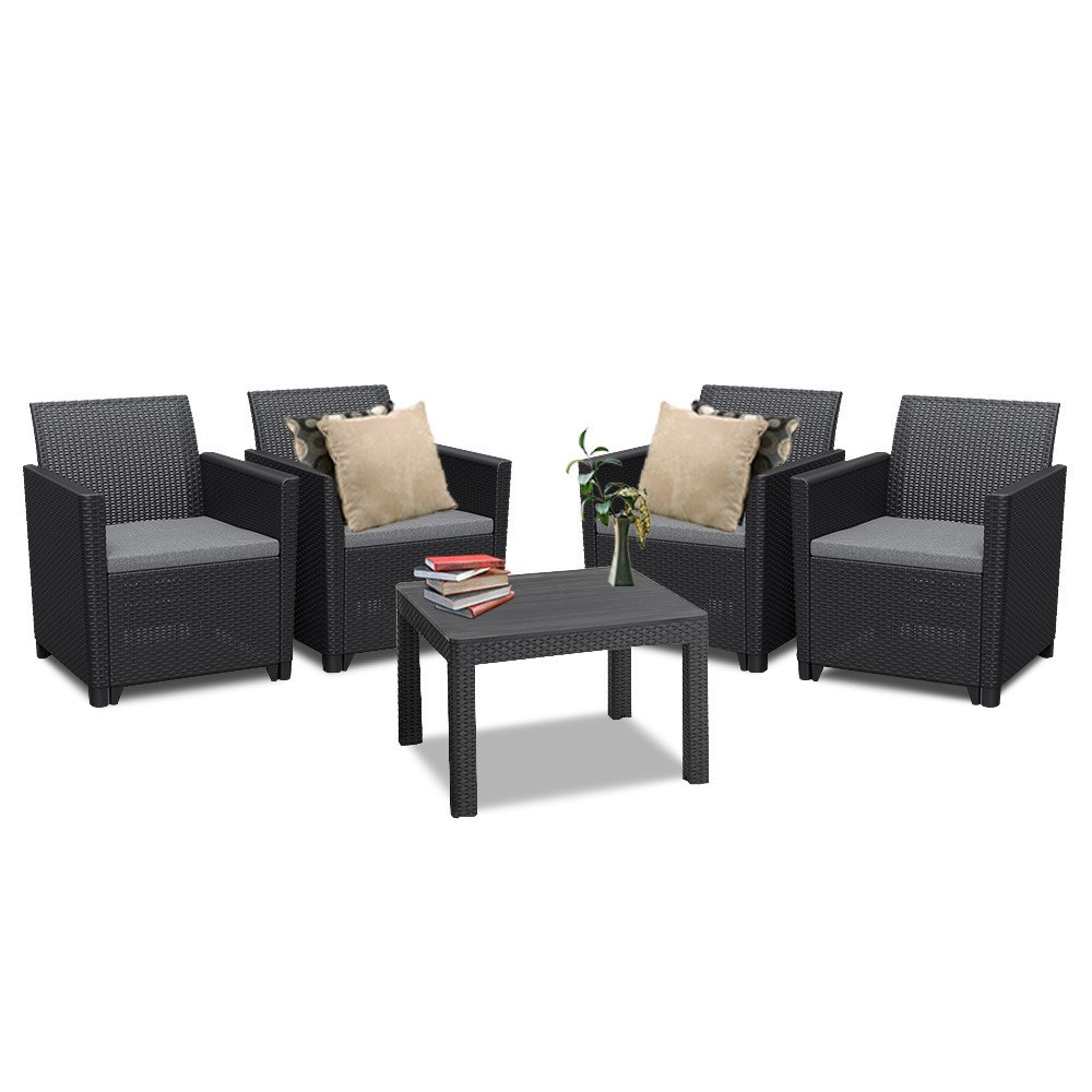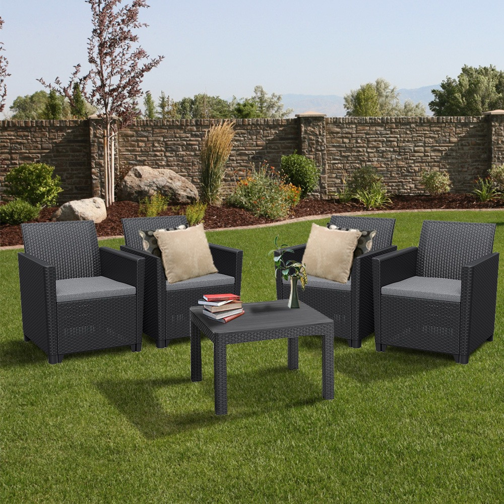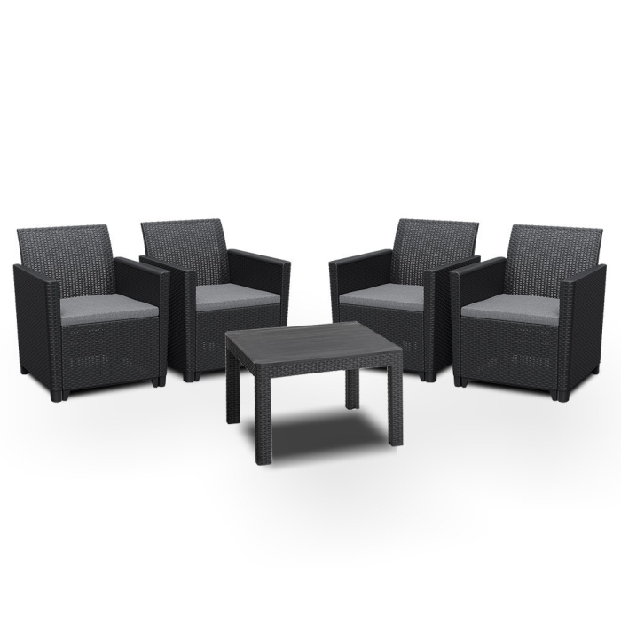 Setul de mobilier de grădină din ratan de culoare grafit este format din patru fotolii de 65x 63 x 74 cm și o masă Orlando de 58,5x 58,5x 43 cm. Acesta este un produs de înaltă calitate, fabricat din plastic turnat prin injecție de cea mai înaltă calitate.