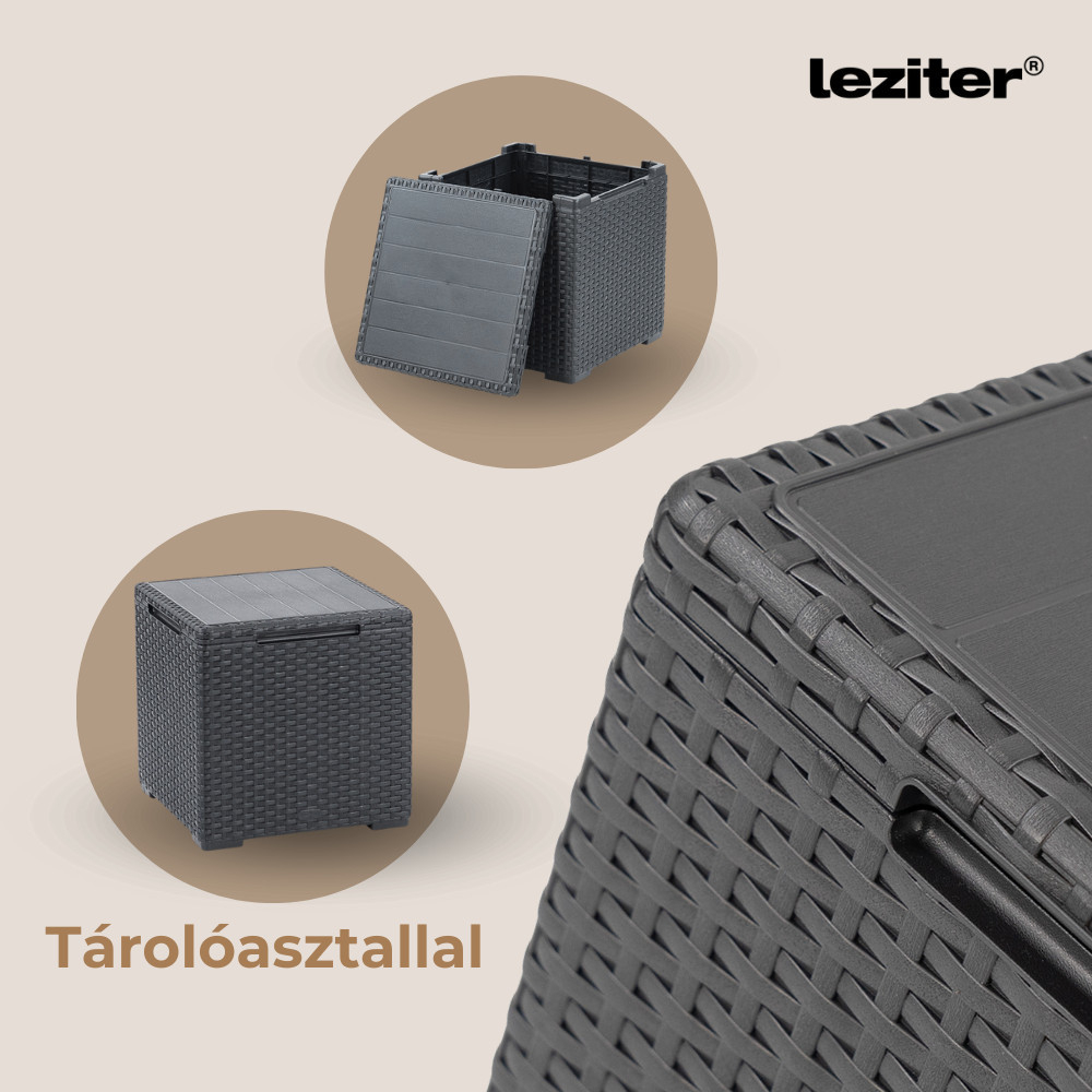 Materiale durabile: Setul este fabricat din plastic durabil și de înaltă calitate, fiind rezistent la deteriorări și la condițiile meteorologice pe termen lung, precum și la radiațiile UV. Datorită culorii sale grafit, tolerează bine murdăria și culoarea sa nu se estompează.