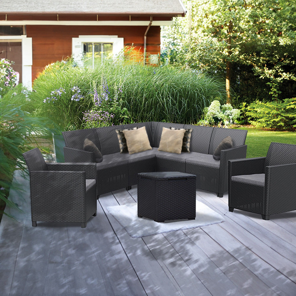Acest set de mobilier de grădină cu efect de ratan grafit include două fotolii, o canapea de colț cu 4 locuri, un fotoliu cu 2 locuri și o masă de depozitare, toate fabricate din plastic rezistent la intemperii, astfel încât nu trebuie să vă faceți griji cu privire la efectele radiațiilor UV. Fotoliul are 74 cm înălțime, 63 cm lățime și 65 cm lungime. Canapeaua are o pernă care o face confortabilă și se asortează cu culoarea mobilei. Masa are 37 cm înălțime, 37 cm lățime și 37 cm lungime. Masa este multifuncțională, așa că vă puteți ascunde uneltele de grădinărit în zona de depozitare.