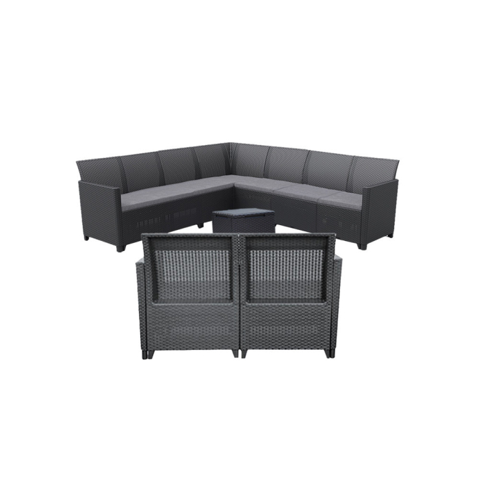 Materiale durabile: Setul este fabricat din plastic durabil și de înaltă calitate, fiind rezistent la deteriorări și la condițiile meteorologice pe termen lung, precum și la radiațiile UV. Datorită culorii sale grafit, tolerează bine murdăria și culoarea sa nu se estompează.