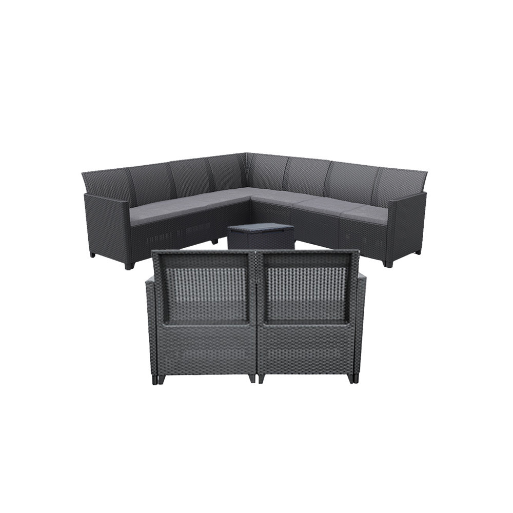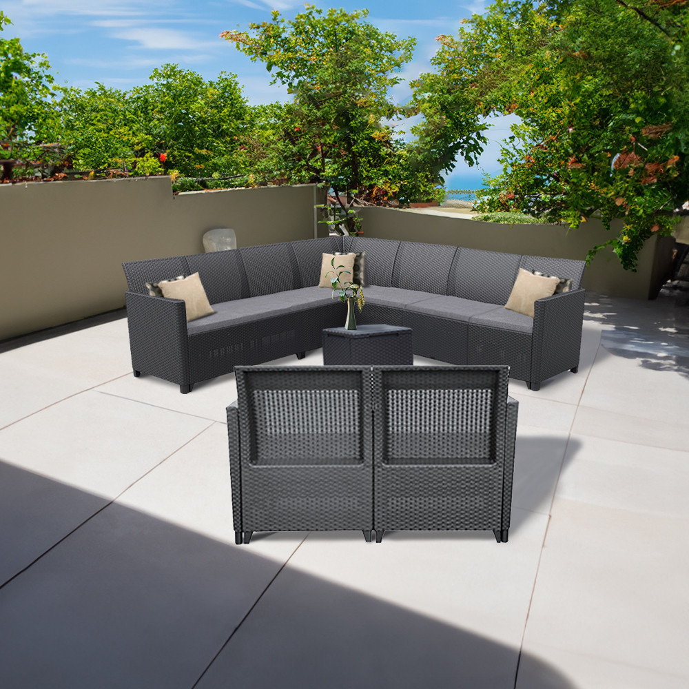 Acest set de mobilier de grădină cu efect de ratan grafit include două fotolii, o canapea de colț cu 9 locuri, o canapea cu 2 locuri și o masă de depozitare, toate fabricate din plastic rezistent la intemperii, așa că nu trebuie să vă faceți griji cu privire la efectele radiațiilor UV. Canapeaua are 74 cm înălțime, 113 cm lățime și 65 cm lungime. Canapeaua are o pernă care o face confortabilă și se asortează cu culoarea mobilei. Masa are 37 cm înălțime, 37 cm lățime și 37 cm lungime. Masa este multifuncțională, așa că poți ascunde uneltele de grădinărit în zona de depozitare.