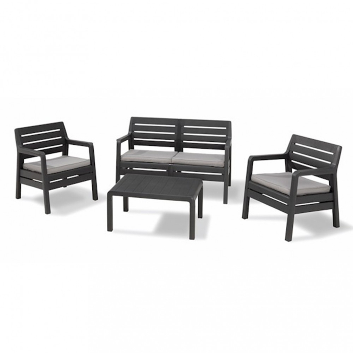 Setul include perne cu fermoare, astfel încât să puteți scoate fața de pernă și să le spălați dacă este necesar. Pernele sunt confortabile și au o grosime de 5 cm. Acest set este format dintr-o canapea cu 2 locuri, 2 fotolii și o măsuță de cafea. Resolith funcțional cu finisaj satinat, asemănător lemnului. Cotiere deschise și spătar cu design ergonomic pentru confort sporit. Mobilierul este foarte simplu, păstrând în același timp o notă modernă. Este fabricat dintr-un material extrem de rezistent - polipropilenă. Este conceput să semene cu lemnul, ceea ce îi conferă un efect extrem de frumos.