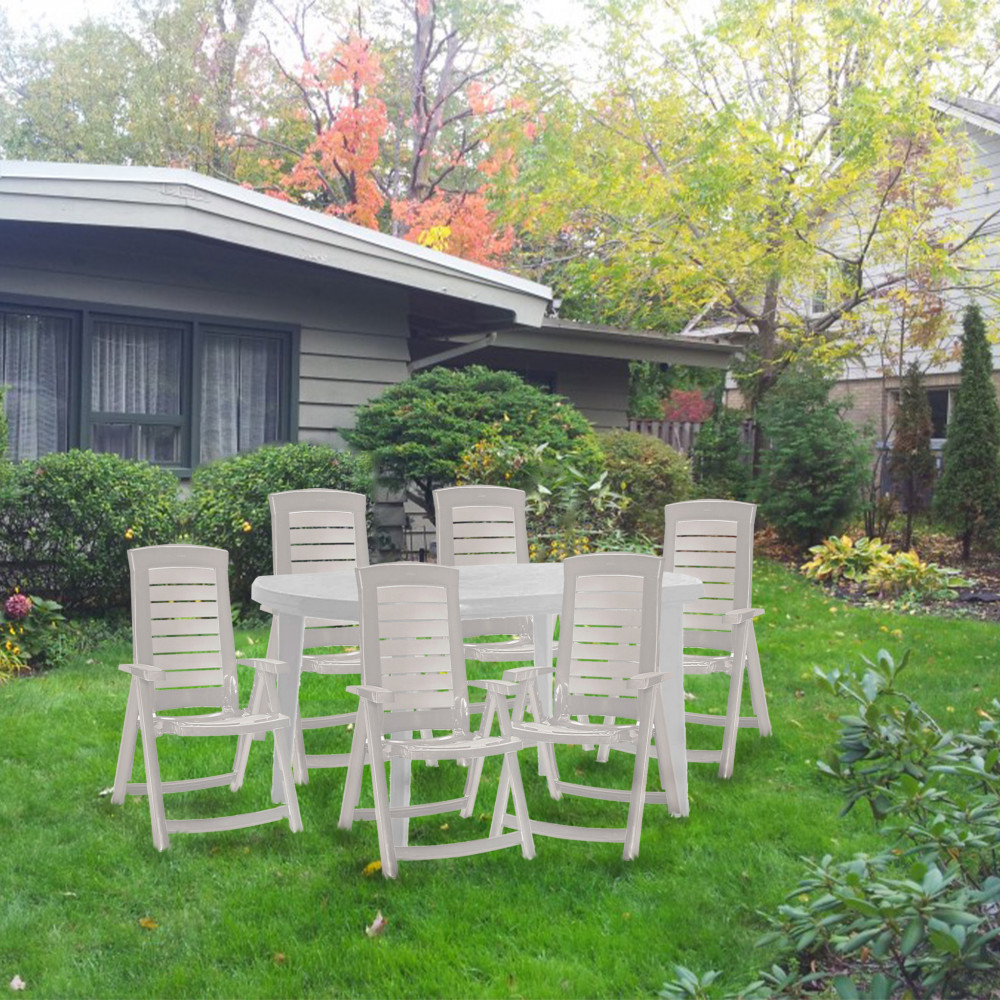Setul de mobilier de grădină Elba 6 în 1 este o alegere perfectă pentru orice grădină sau terasă. Simplu, dar modern, ceea ce face setul și mai special. Este rezistent la condiții meteorologice extreme și, prin urmare, își păstrează forma originală ani de zile. Setul nu necesită întreținere sau curățare specială. Se recomandă ștergerea cu un prosop moale îmbibat în detergent.