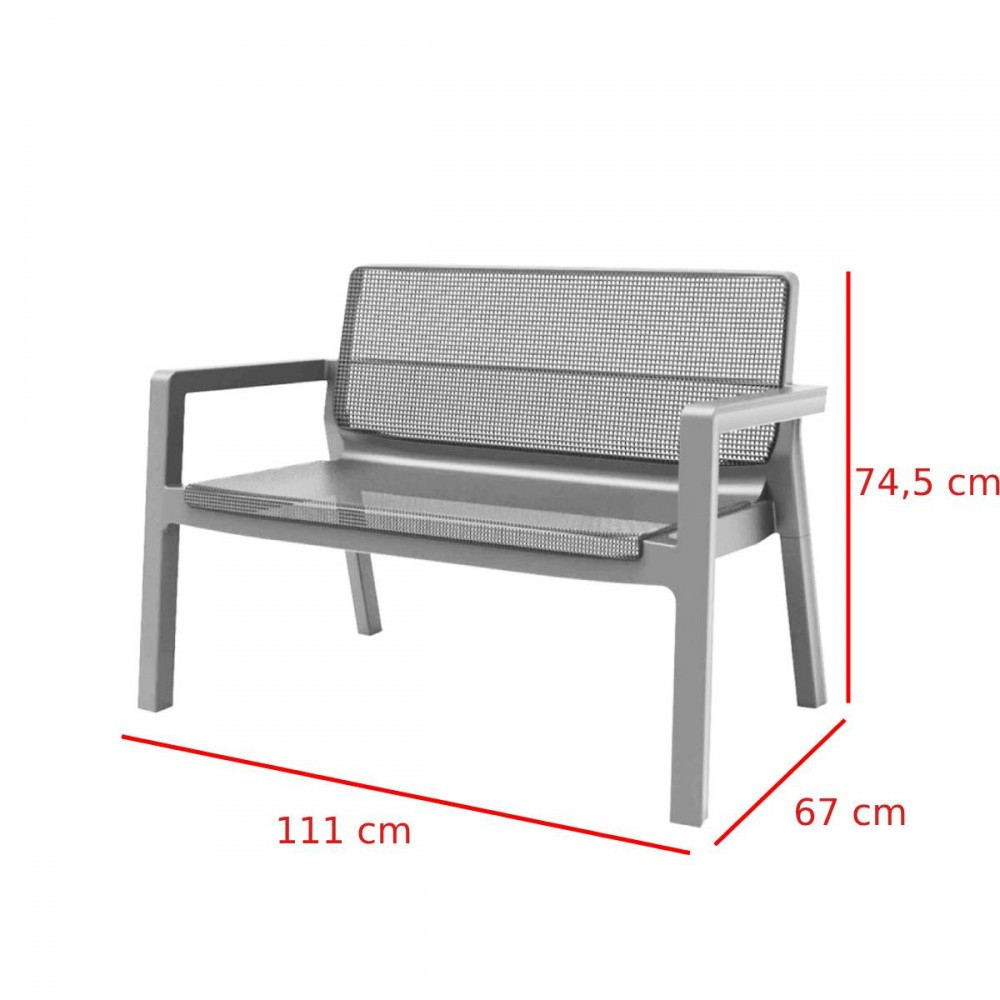 Forma ergonomică a mobilierului asigură o relaxare confortabilă - chiar și fără perne de șezut. Setul include 2 fotolii, o canapea cu două locuri și o măsuță de cafea. Exterior elegant cu zăbrele și construcție din plastic durabilă, ușor de întreținut.