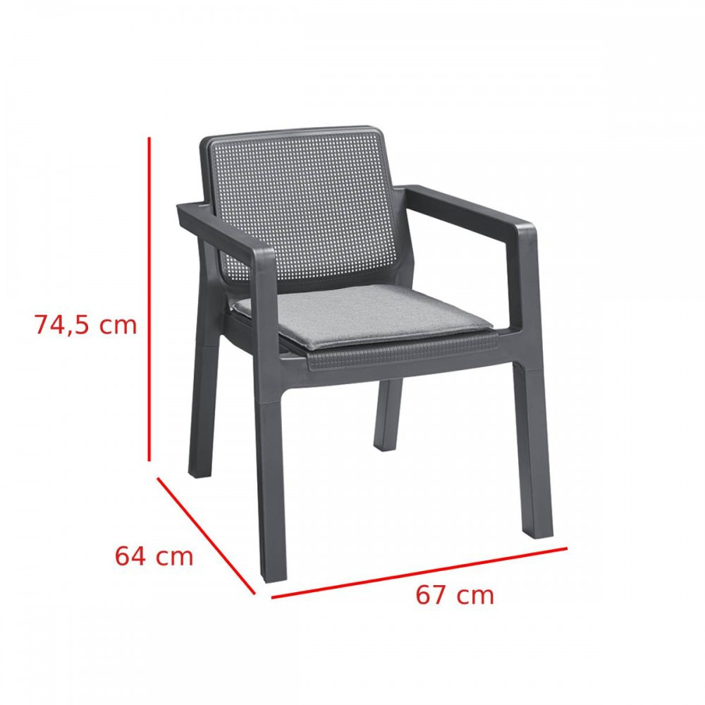 Forma ergonomică a mobilierului asigură o relaxare confortabilă - chiar și fără perne de șezut. Setul include 2 fotolii, o canapea cu două locuri și o măsuță de cafea. Exterior elegant cu zăbrele și construcție din plastic durabilă, ușor de întreținut.