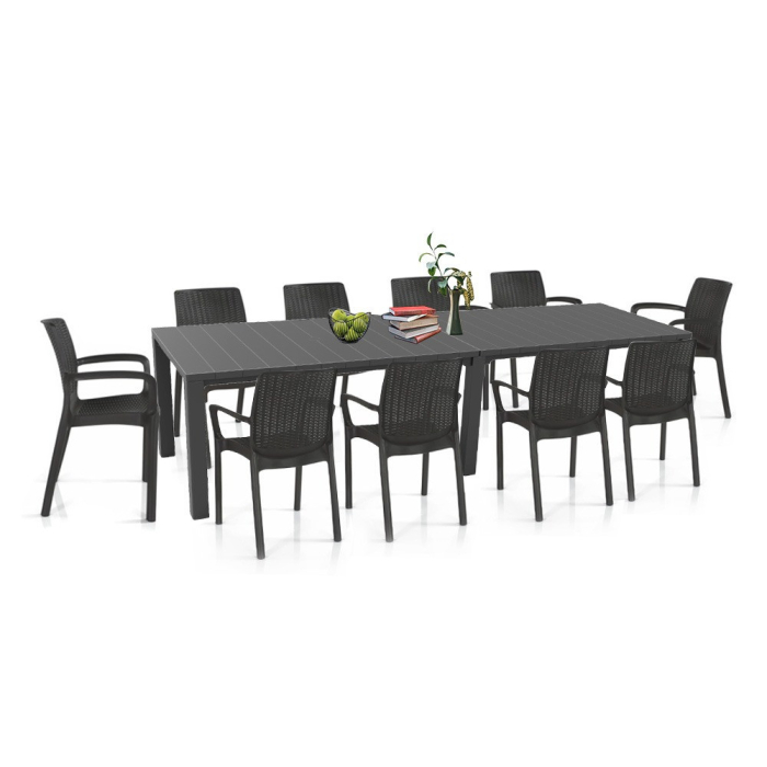 Masa din set este concepută pentru scopuri speciale. Poate fi folosit în 3 configurații: ca dreptunghi mai mic pentru 6 persoane, ca dreptunghi mai mare pentru 8-10 persoane și ca versiune pătrată pentru 8-10 persoane. Masa are un stil clasic, un design bine gândit și este practică de utilizat. Cu această masă, puteți organiza cu ușurință o petrecere de familie sau o reuniune mai mare de prieteni, iar toată lumea va încăpea cu siguranță la masă. Produsul este extrem de durabil, rezistent la deteriorări și condiții meteorologice nefavorabile, inclusiv radiații UV. Este extrem de ușor de asamblat și de întreținut. Setul include un scaun universal cu cotiere, care oferă o structură stabilă și un design elegant. Scaunul este perfect pentru utilizare în grădini, terase, balcoane și în interior. Un produs durabil, rezistent la intemperii și radiații UV. Ușor de curățat.