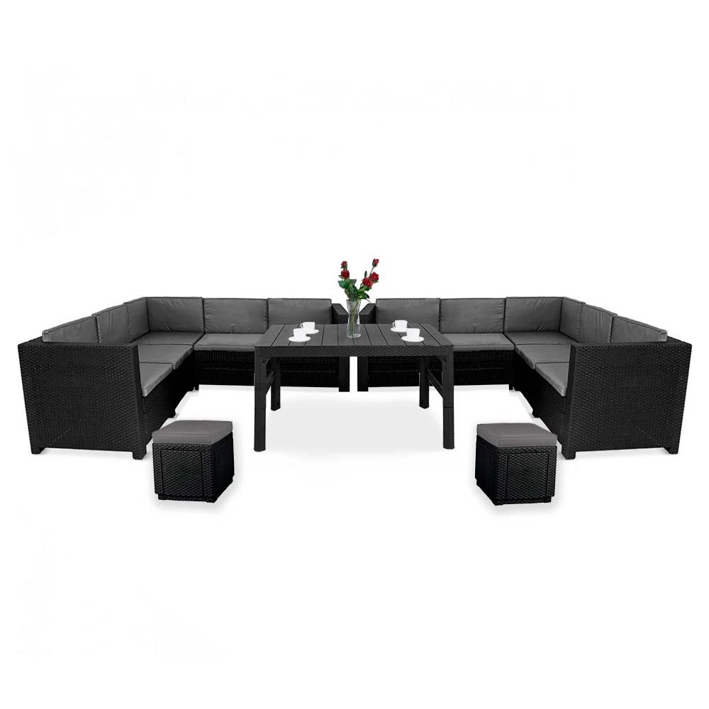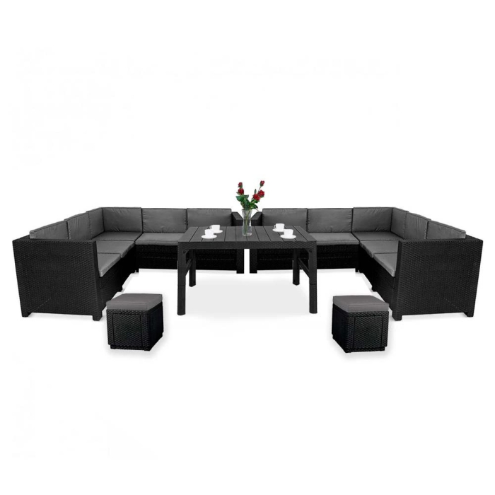 Produsul prezentat este un set funcțional de mobilier de grădină care include două canapele de colț, două pufuri și o masă ridicată. Înălțimea mesei poate fi de 40 sau 65 de centimetri, ceea ce vă permite să o adaptați nevoilor actuale - setul este completat de perne confortabile, estetice, pentru șezut și spătar, care sporesc confortul.