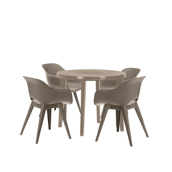 Acest set de mobilier de culoare cappuccino , confortabil și elegant, este format din patru piese cu dimensiunile de 57X 56X81 cm. Include un scaun și o masă rotundă de 90x73 cm . Acest set de mobilier de grădină pentru 4 persoane poate fi extrem de benefic dacă doriți să vă bucurați de timpul petrecut în aer liber cu prietenii sau familia. Servește ca element ideal pentru decorarea grădinii, balconului sau terasei. Aspectul său minimalist îl face universal și se adaptează oricărei configurații. Setul este o soluție practică, putând fi lăsat afară tot timpul anului, deoarece are o durabilitate ridicată și este rezistent la condiții meteorologice extreme.