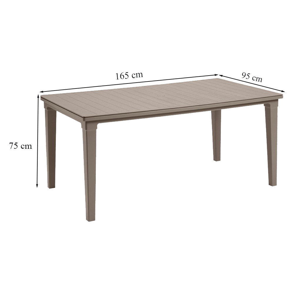 Masa poate părea din lemn, dar de fapt este fabricată din plastic de înaltă calitate. Blatul mesei este plat, permițându-vă să așezați cu ușurință farfurii pe el. În mijlocul mesei există o deschidere pentru o umbrelă de soare, care poate fi închisă cu un dop. Masa dreptunghiulară va atrage pe oricine apreciază stilul curat și simplitatea. Produsul este ușor de asamblat și ușor de curățat. Masa este rezistentă la deteriorări și la condițiile meteorologice pe termen lung.