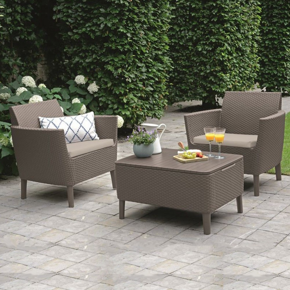 Setul de mobilier de grădină Curver Salemo este fabricat dintr-un material durabil și rezistent, care rezistă efectelor condițiilor meteorologice schimbătoare, radiațiilor UV și amplitudinilor de temperatură. Nu necesită întreținere sau utilizarea unor produse speciale de îngrijire, ceea ce economisește bani. Din punct de vedere vizual, mobila arată bine. Designul lor universal, inspirat de stilul scandinav și de culorile cappuccino, le face să se găsească în toate amenajările, atât tradiționale, cât și moderne. Blatul măsuței de cafea este durabil și rezistent la condițiile meteorologice schimbătoare, ceea ce îi conferă un aspect elegant. Textura sa este netedă. Rășina protejează produsul de efectele radiațiilor ultraviolete, ruginii sau putregaiului, astfel încât setul va servi mai multe sezoane fără a-și pierde aspectul original.