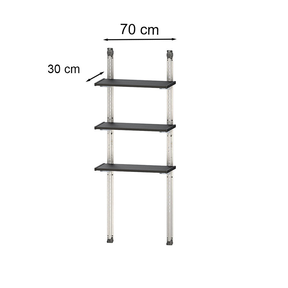Dimensiunile produsului sunt: 70 cm lățime și 30 cm adâncime , iar înălțimea sa este reglabilă , ceea ce oferă flexibilitate maximă în timpul depozitării. Sistemul de rafturi are un aspect curat și modern, iar structura metalică garantează o durată lungă de viață.
