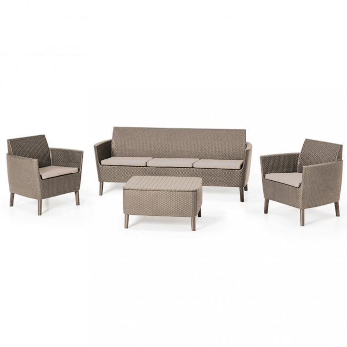 Setul de trei locuri Salemo oferă un spațiu în care 5 persoane se pot relaxa. Setul oferă un nivel ridicat de confort în utilizare, care este influențat semnificativ de pernele scaunului, spătarele și cotierele late. Măsuța de cafease mândrește cu o textură atractivă de răchită. Compartimentul de depozitare poate fi folosit și pentru a depozita pernele iarna sau atunci când afară plouă abundent.