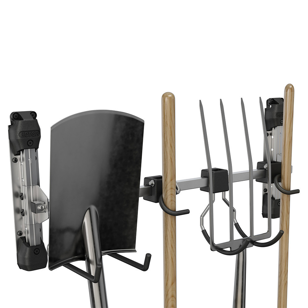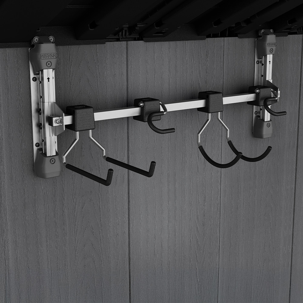 În spatele suportului de perete Keter se află inginerie de calitate industrială și utilizarea de materiale durabile. Învelișul cauciucat de pe cârligele reglabile nu numai că protejează uneltele, dar asigură și o prindere antiderapantă.