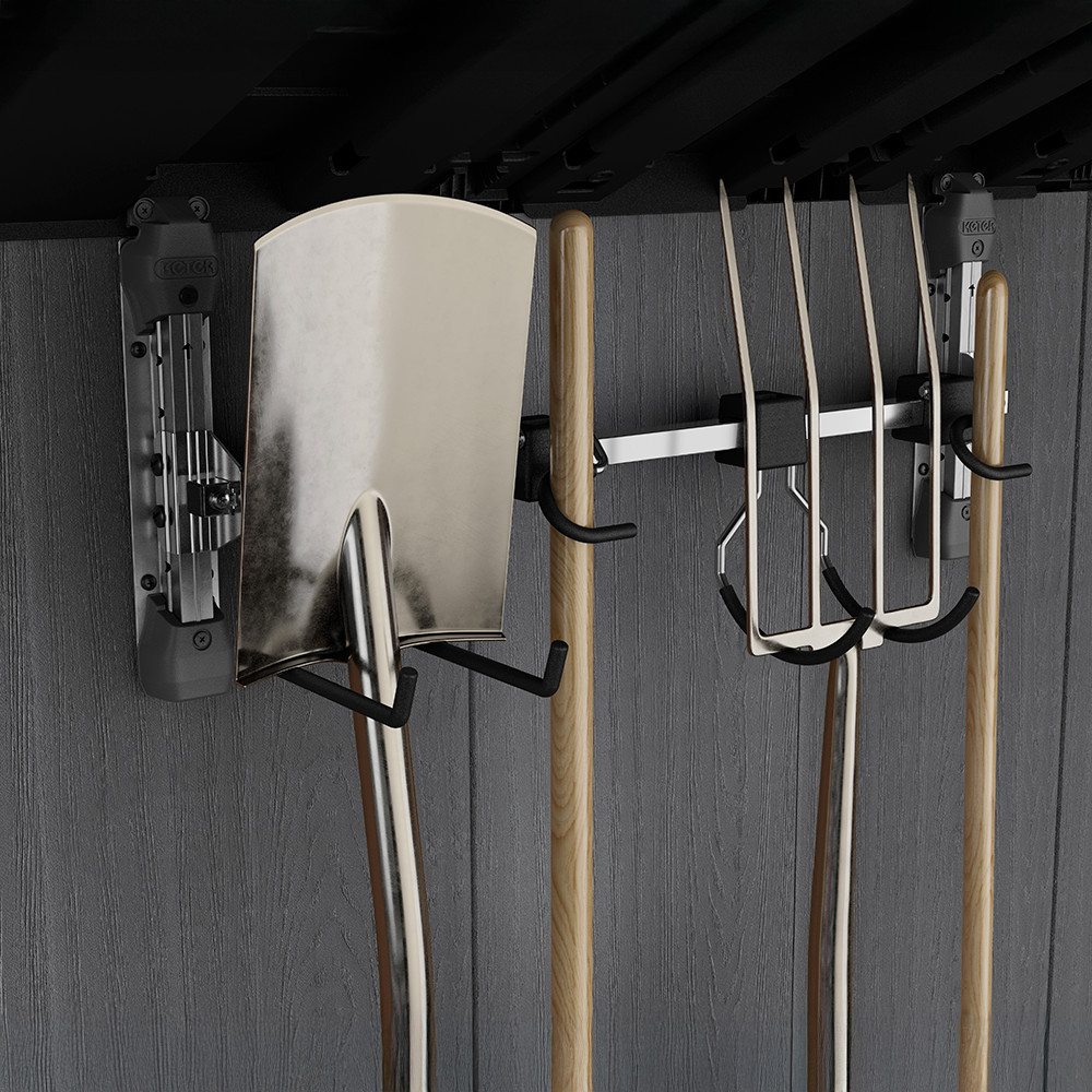 Datorită cârligelor glisante cu blocare a poziției, fiecare unealtă este plasată exact acolo unde este cel mai practic. De asemenea, puteți așeza o lopată, un furtun sau alte unelte de grădinărit pe el - un sistem complet personalizabil!
