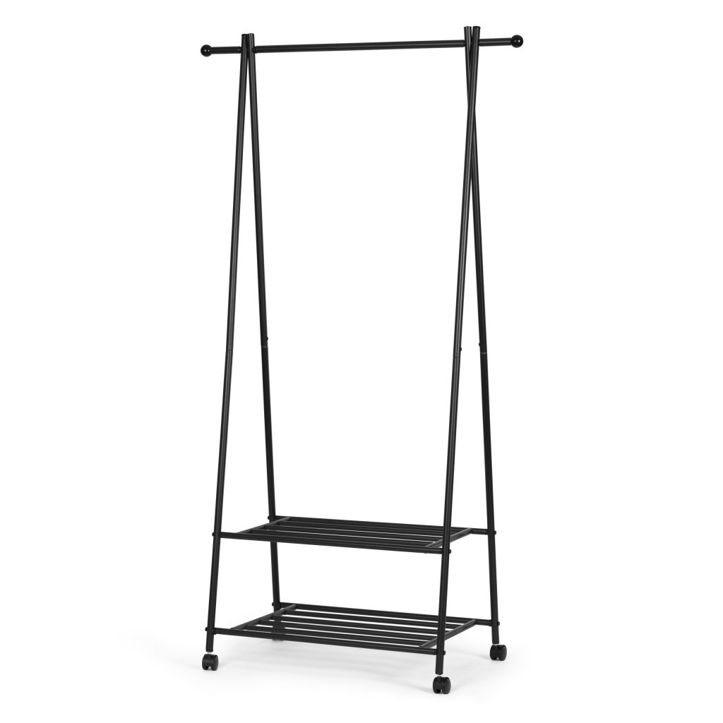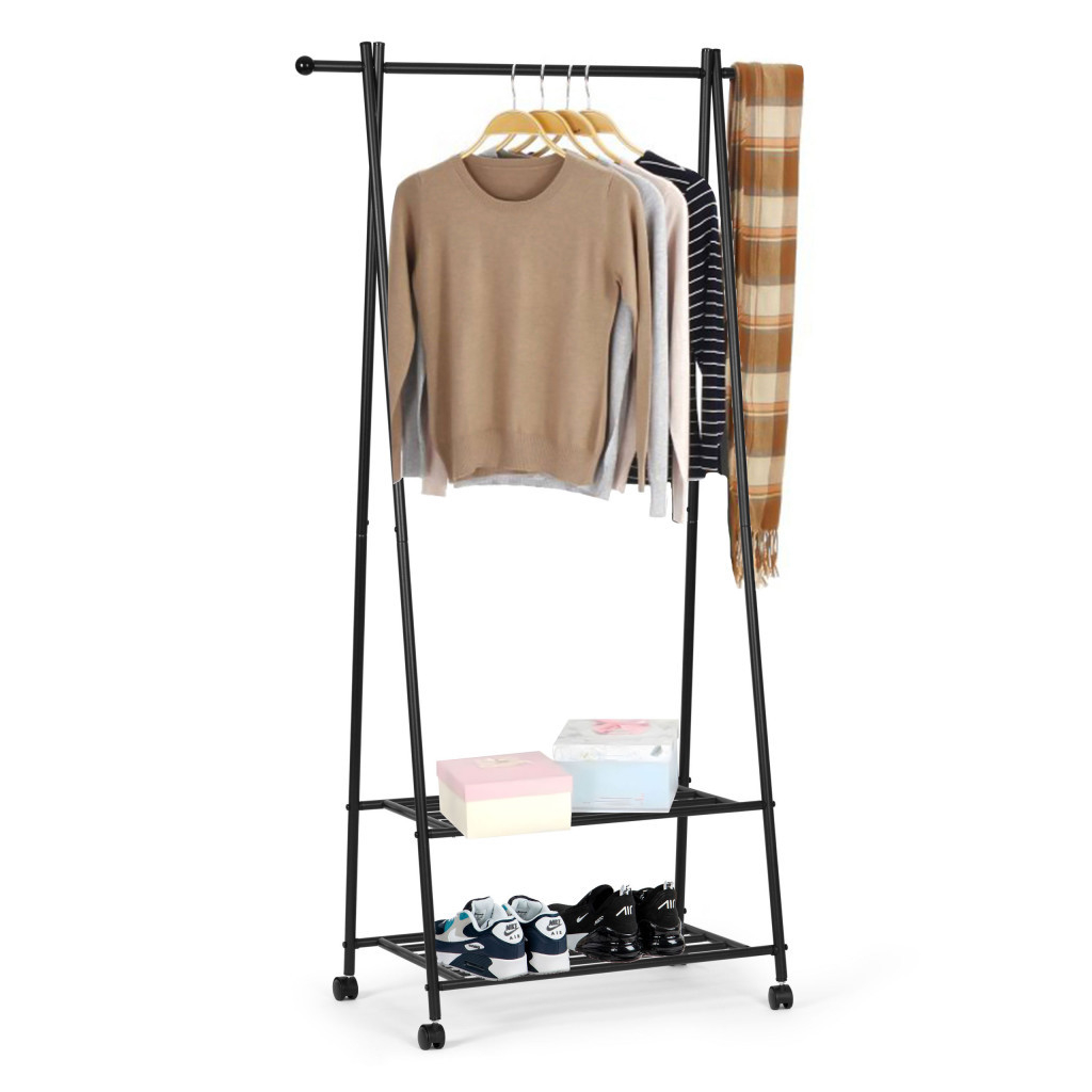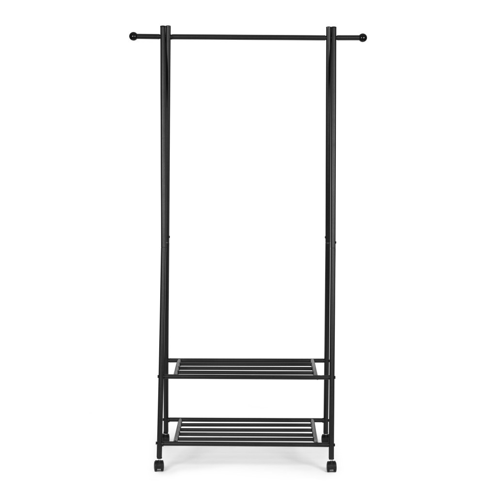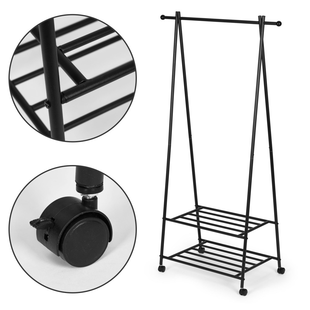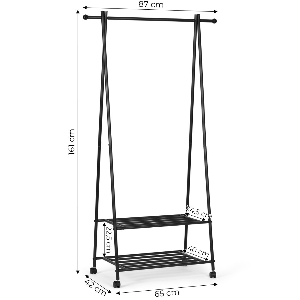 Suportul are două rafturi funcționale în partea inferioară, pe care puteți pune articole de îmbrăcăminte mai mici, genți de mână și chiar pantofi.