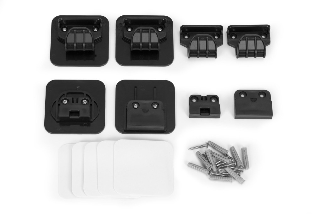 Poarta de securitate ECOTOYS include un kit complet de montare pentru o instalare rapidă și ușoară oriunde. Kitul include **suporturi, strunguri puternice și benzi de fixare autoadezive** pentru o fixare stabilă și sigură.