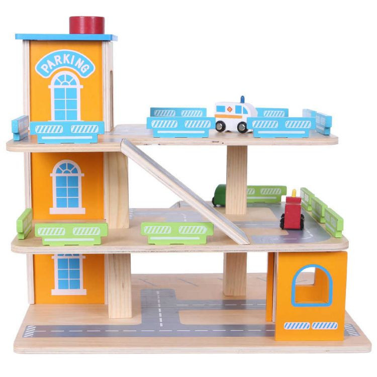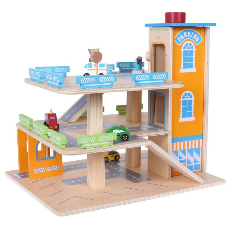 Garajul din lemn este echipat cu un lift mobil. Acesta găzduiește mașina din set, pe care copilul o poate transporta în partea de sus a parcării folosind butonul roșu. Aceasta este o ocazie excelentă pentru micuțul dvs. de a-și exersa dexteritatea cu ambele mâini în timp ce se distrează.