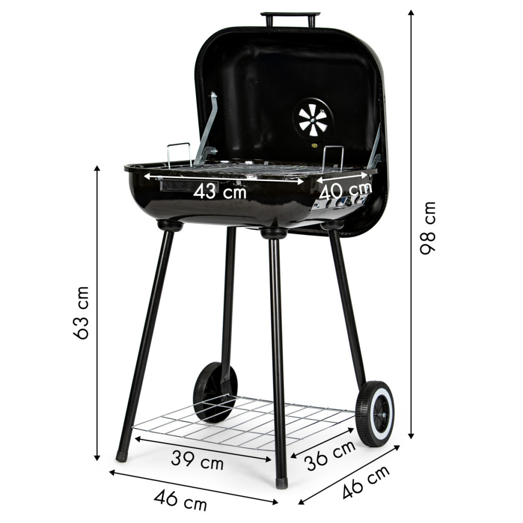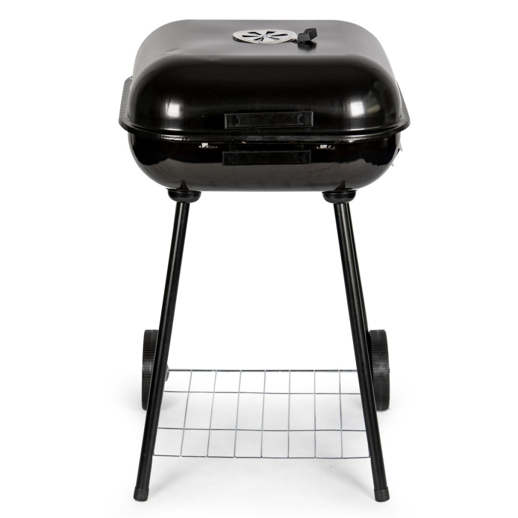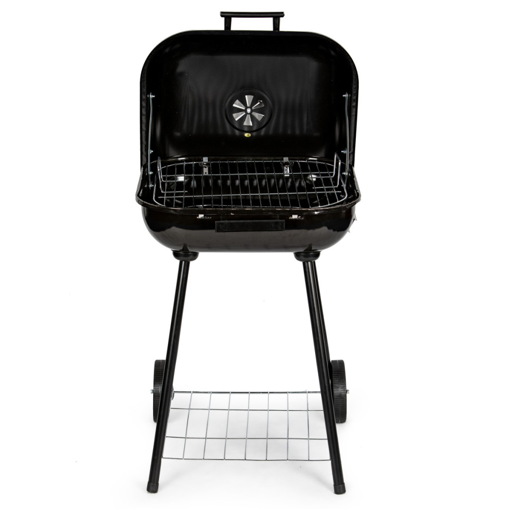 Sub focar se află un raft practic pentru depozitarea cărbunelui sau a altor accesorii pentru grătar.