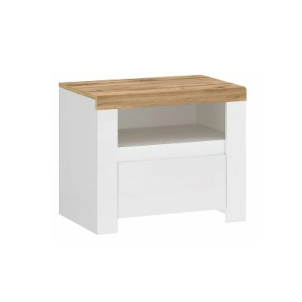 Pentru ca un dormitor să fie complet funcțional, este nevoie și de o noptieră. Noptiera din colecție are un front alb și un blat din stejar, cu un raft deschis și un sertar care poate găzdui toate bibelourile de care ai nevoie înainte de culcare.