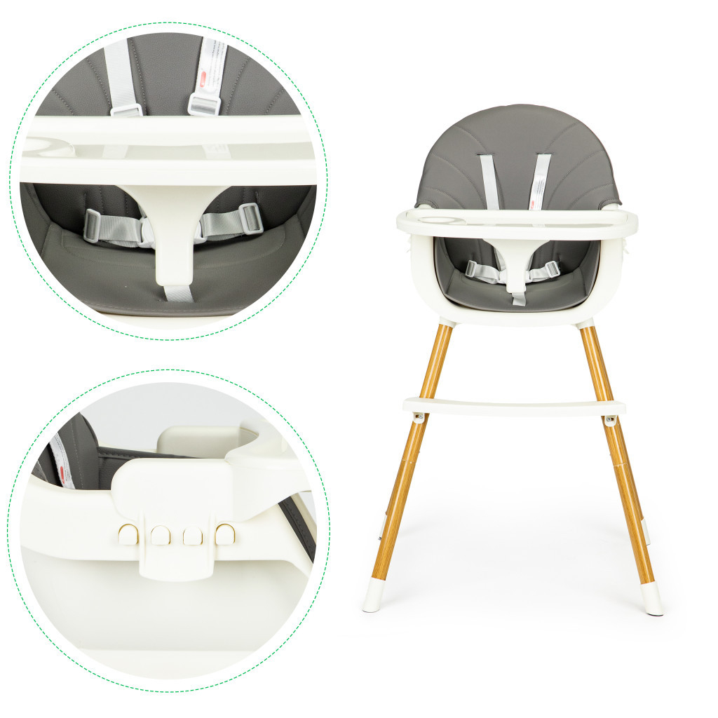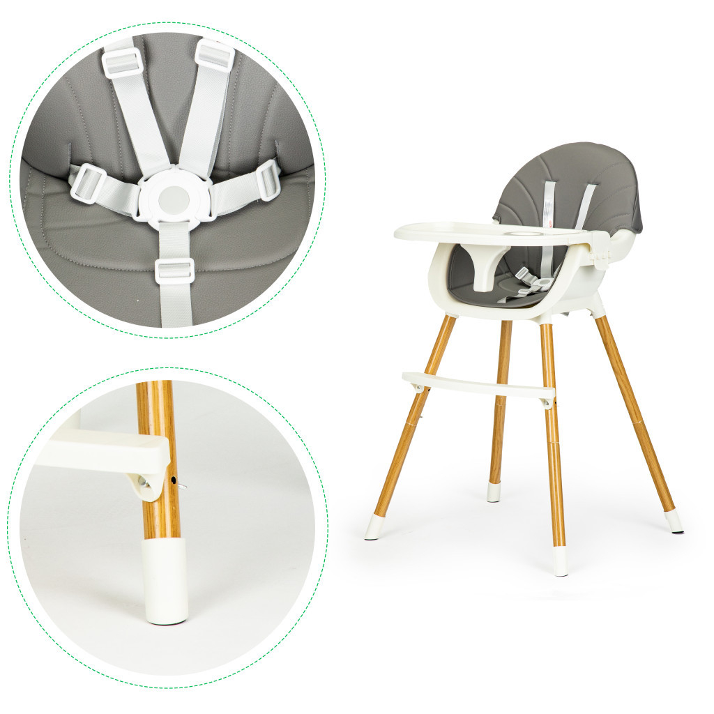 Înălțimea scaunului este reglabilă. Picioarele și suporturile pentru picioare pot fi ușor deșurubate, transformând un scaun înalt într-un scaun jos.