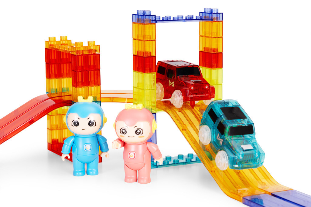 Elementele pistei se conectează cu magneți siguri încorporați în structura lor, permițând copiilor să creeze rapid și ușor rampe, curbe și înclinații unice. Alte piese din set funcționează ca blocuri tradiționale folosite pentru a construi piloni, turnuri și multe alte structuri - oadevărată plăcere pentru tinerii pasionați de construcții.