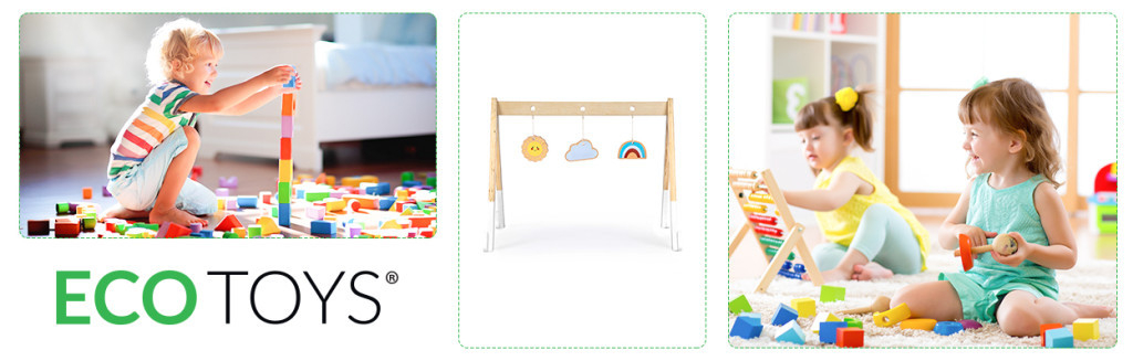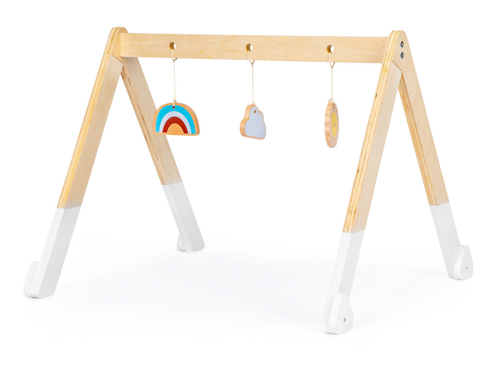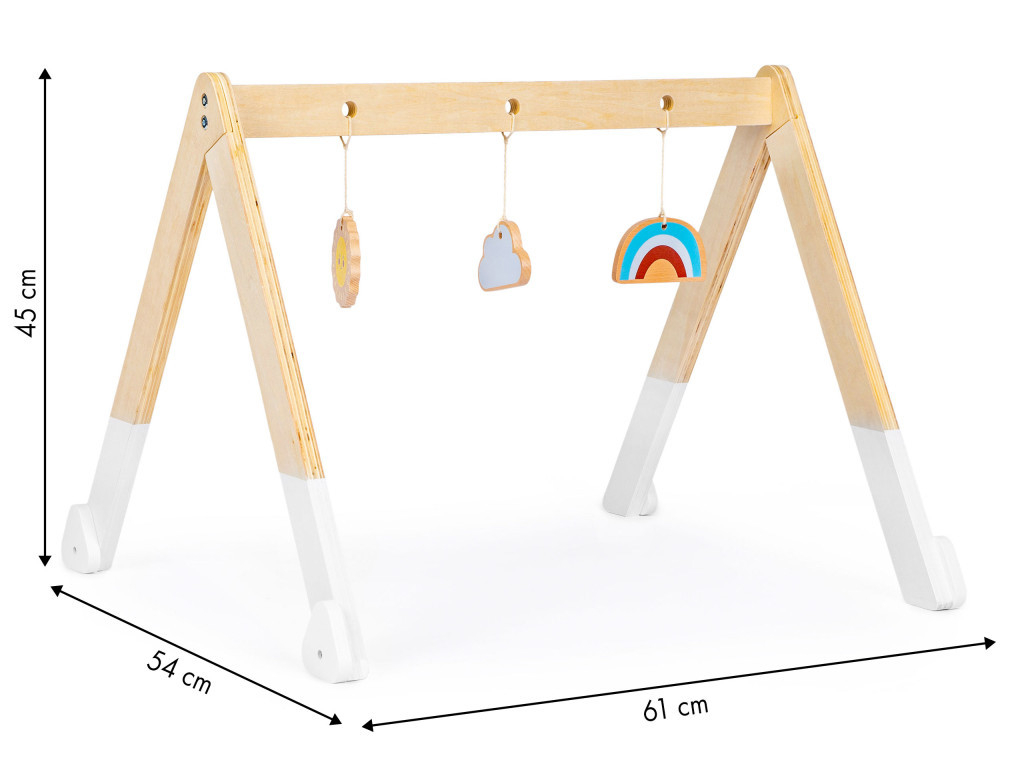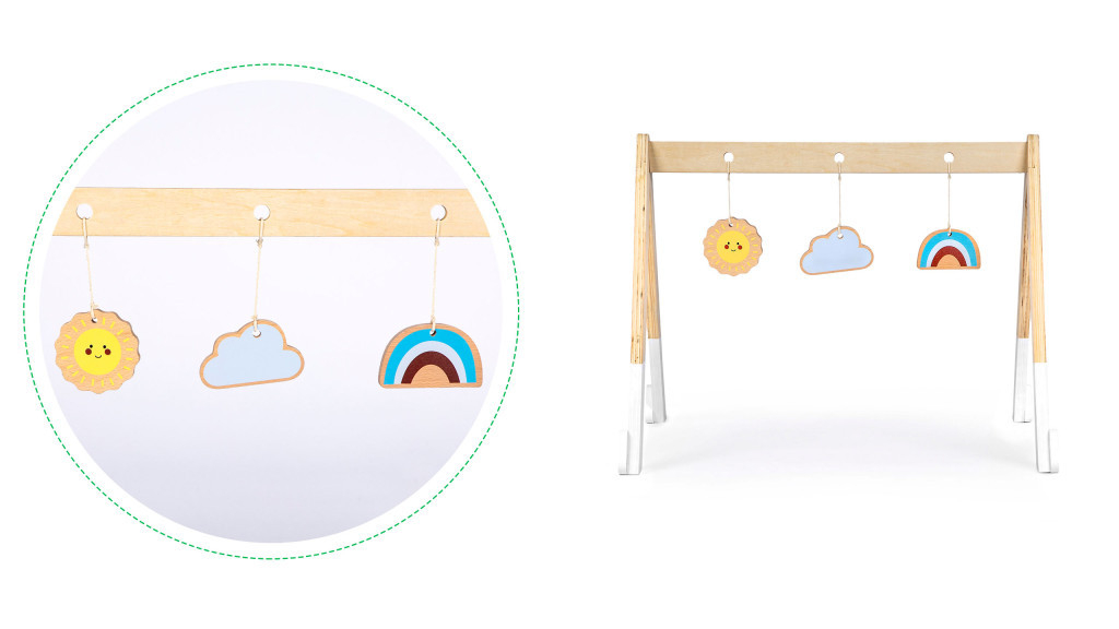Întregul este realizat din lemn, cu 3 jucării colorate agățate de bara sa transversală. Fiecare jucărie are o formă și o culoare diferită, astfel încât stimulează copilul în mod corespunzător. Jucăria nu are margini ascuțite, periculoase și este acoperită cu vopsea sigură pentru copii.