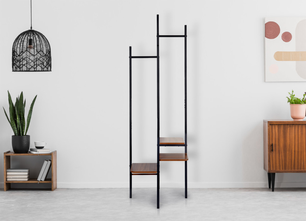 ✧ Raftul din partea inferioară are 4 rafturi funcționale la înălțimi diferite. Rafturile pot fi folosite pentru a depozita genți, rucsacuri sau articole mici de îmbrăcăminte.