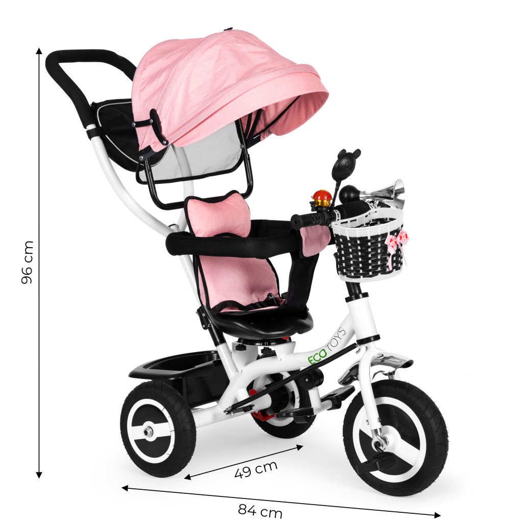 Bicicleta ECOTOYS combină o serie de soluții practice pentru a oferi copilului dvs. un mediu de joacă confortabil și sigur. Bicicleta are un spătar moale și confortabil pentru ca cel mic să se simtă bine, precum și centuri și bare pentru a-l proteja de căderea de pe scaun. Copertina rabatabilă oferă protecție împotriva ploii și a soarelui. Cadrul special profilat și scaunul pivotant facilitează urcarea celor mici.