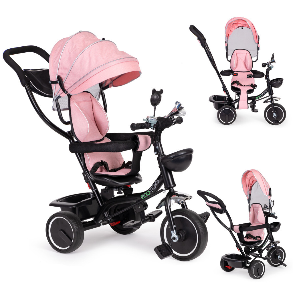 Bicicleta ECOTOYS combinămulte soluții practice pentru a oferi copilului dvs. o joacă confortabilă și sigură. Bicicleta are un spătar moale și confortabil care îl va ține pe cel mic așezat confortabil, iar centurile și șinele îl protejează de căderea de pe scaun. Acoperișul pliabil oferă protecție împotriva ploii și a soarelui. Cadrul special profilat și scaunul pivotant facilitează urcarea celor mici.