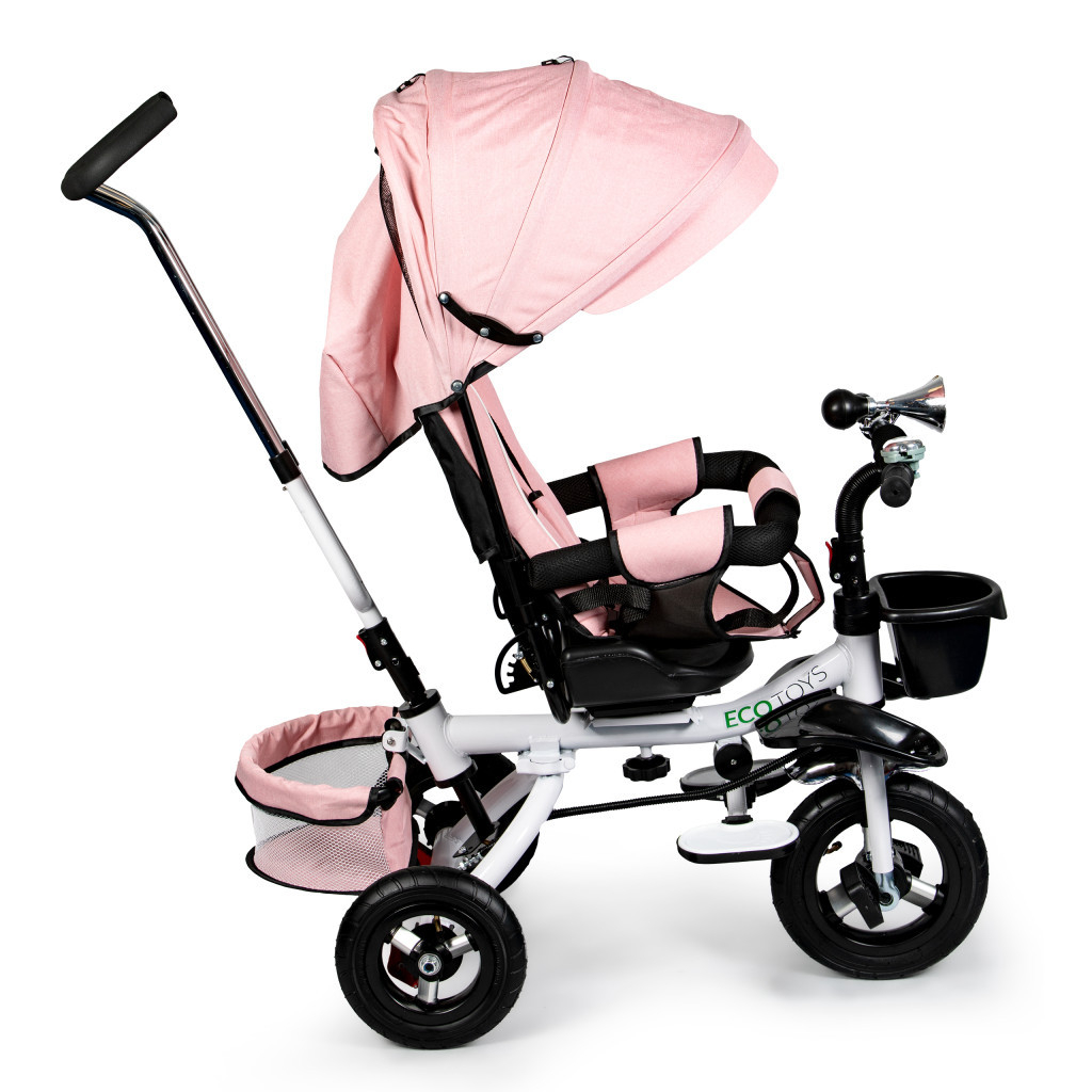 Tricicleta ECOTOYS combină o serie de soluții practice pentru a se asigura că copilul dvs. se poate bucura de o distracție confortabilă și sigură. Are un spătar moale, confortabil și reglabil pentru ca micuțul tău să se simtă confortabil, în timp ce hamul și barele de siguranță îi împiedică să cadă de pe scaun. Acoperișul pliabil protejează împotriva ploii și a soarelui. Cadrul de formă specială și scaunul pivotant facilitează urcarea și coborârea copiilor mai mici.