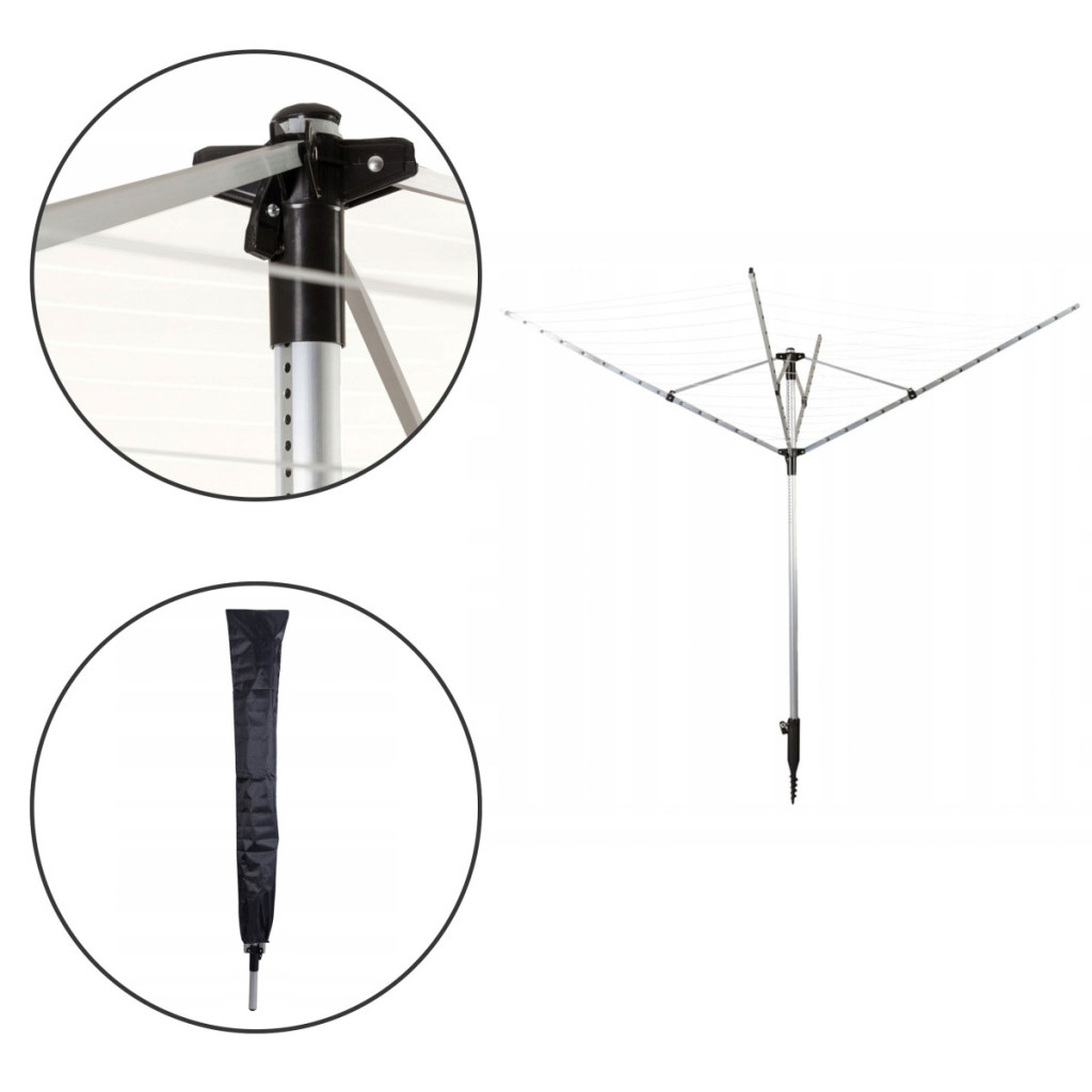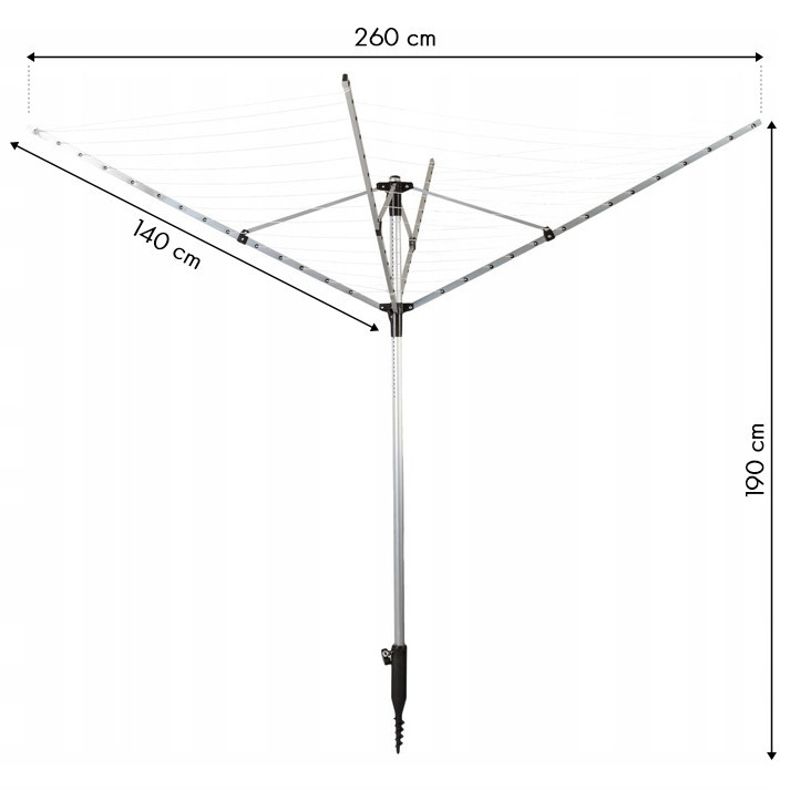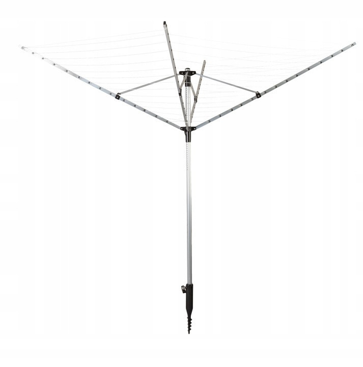 Uscătorul este fabricat din aluminiu, ceea ce îl face ușor, dar durabil și rezistent la intemperii. Designul său pivotant facilitează agățarea și scoaterea hainelor. Fixarea specială cu șuruburi la sol asigură stabilitate chiar și în condiții de vânt puternic. Brațele late ale uscătorului (140 cm) oferă o pentru uscarea articolelor de îmbrăcăminte mai mari, cum ar fi lenjeria de pat, cearșafurile și păturile.
