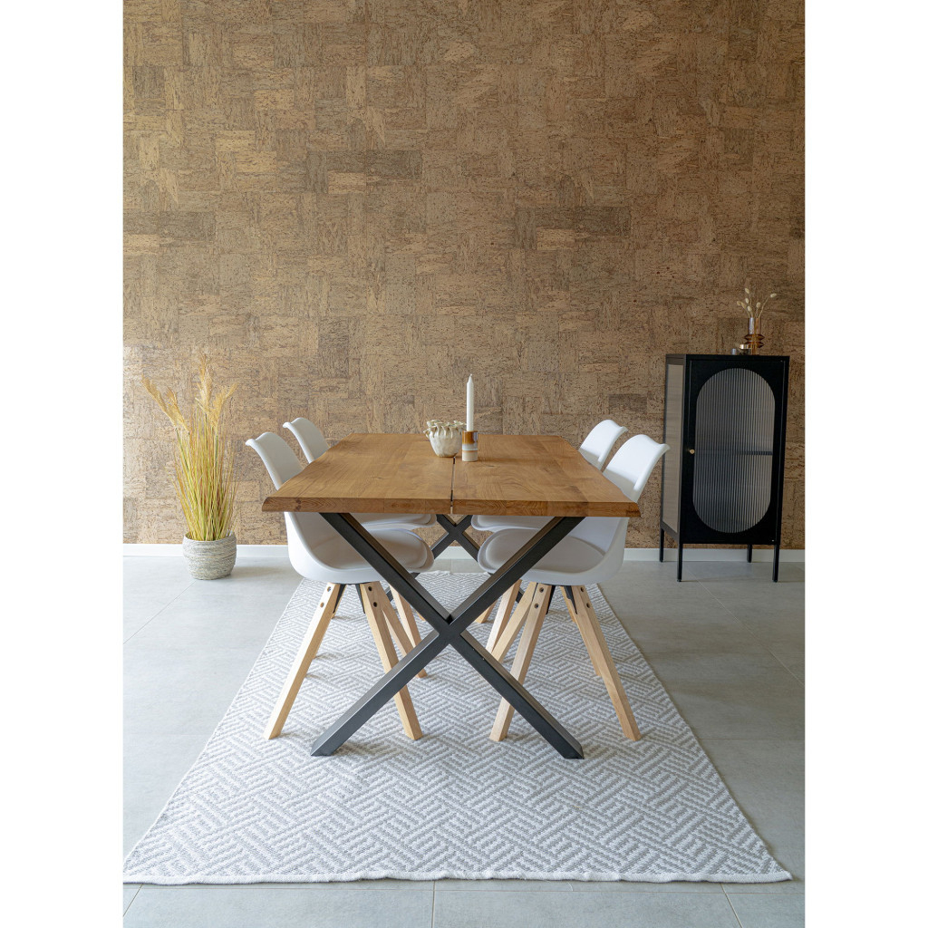 Material cu aspect natural și aspect modern Blatul mesei este furniruit din MDF de stejar, care: prin tonul său deschis, sporește senzația de spațiu, creează o atmosferă confortabilă, familiară și poate fi combinat cu accesorii naturale, albe, bej sau chiar închise la culoare. Rama piciorului central este robustă, stabilă și caracteristică designului - nu interferează cu confortul spațiului pentru picioare, accentuând în același timp vizual forma ovală.
