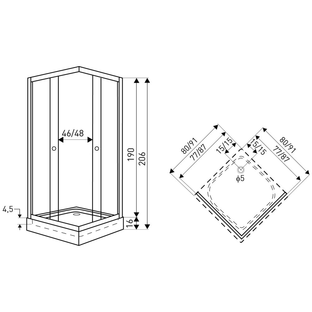 Cabina de duș este echipată cu sticlă securizată modelată, securizată, de 4 mm. Cabina de duș este disponibilă într-un design pătrat. Este echipat cu o ușă glisantă dublă , tip rulou. Cabina are dimensiunile de 91x91x190 cm.