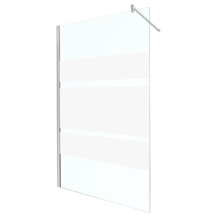 Are sticlă securizată transparentă securizată de 8 mm, cu decorațiune în dungi alb lăptos. Profil din aluminiu cromat .