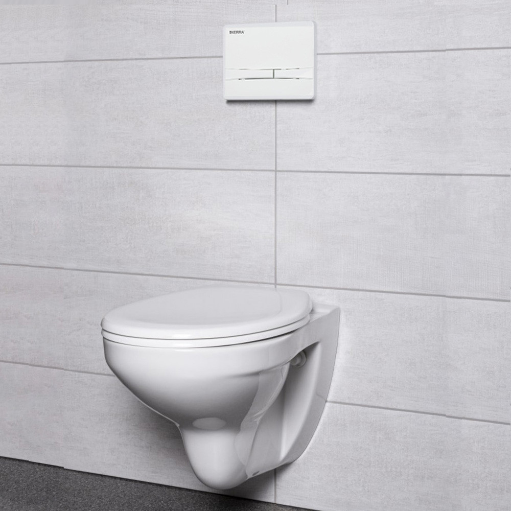 Setul include: 1 cadru de montare ascuns cu rezervor, 1 vas de toaletă Sydney, 1 capac de toaletă Julia (duroplast, închidere silențioasă), 1 clapetă de acționare dublă (albă)