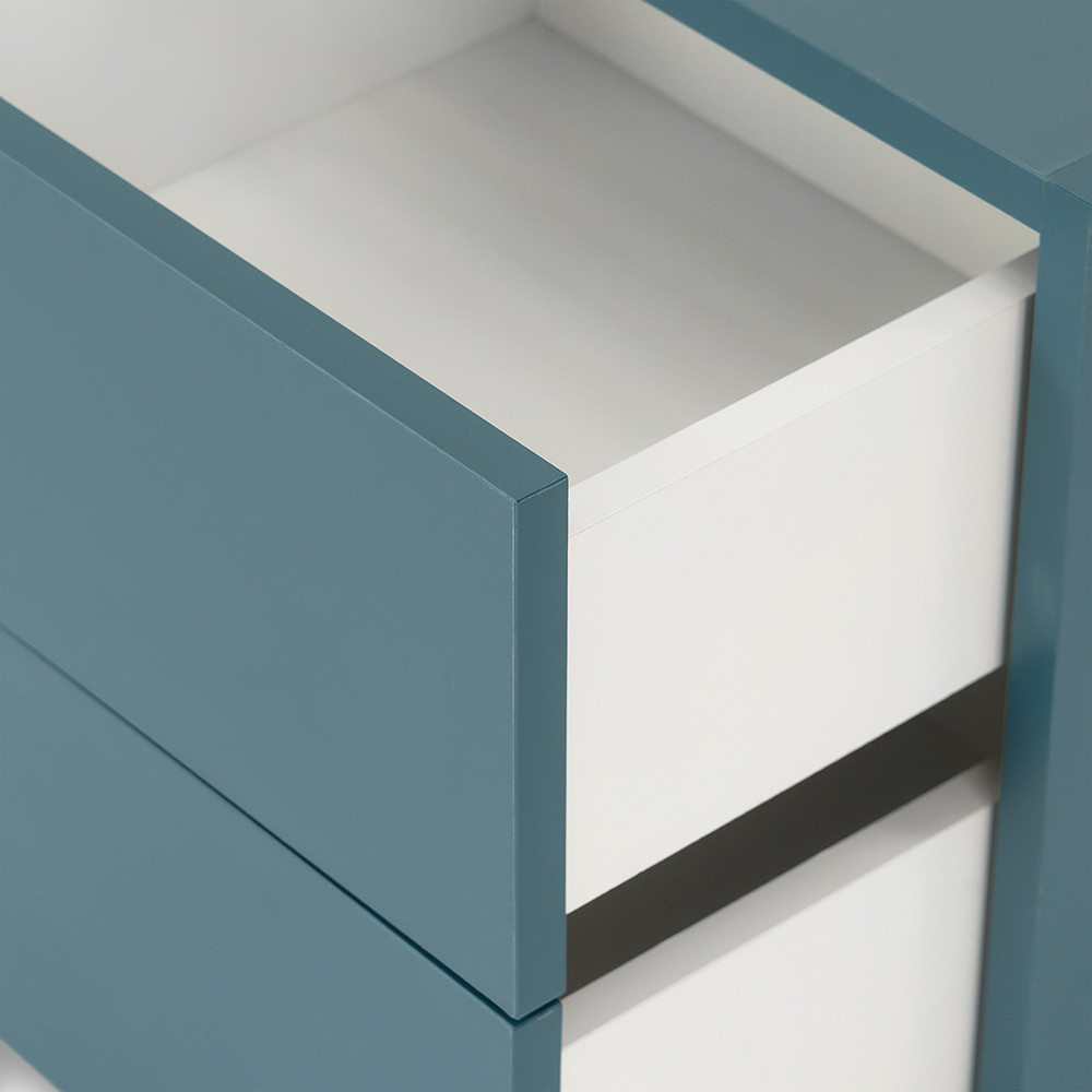 Dulapul de perete Boxie albastru petrol cu 2 sertare este o alegere ideală pentru designerii de interior conștienți, proprietarii de locuințe mici și toți cei care apreciază depozitarea variabilă și decorativă.