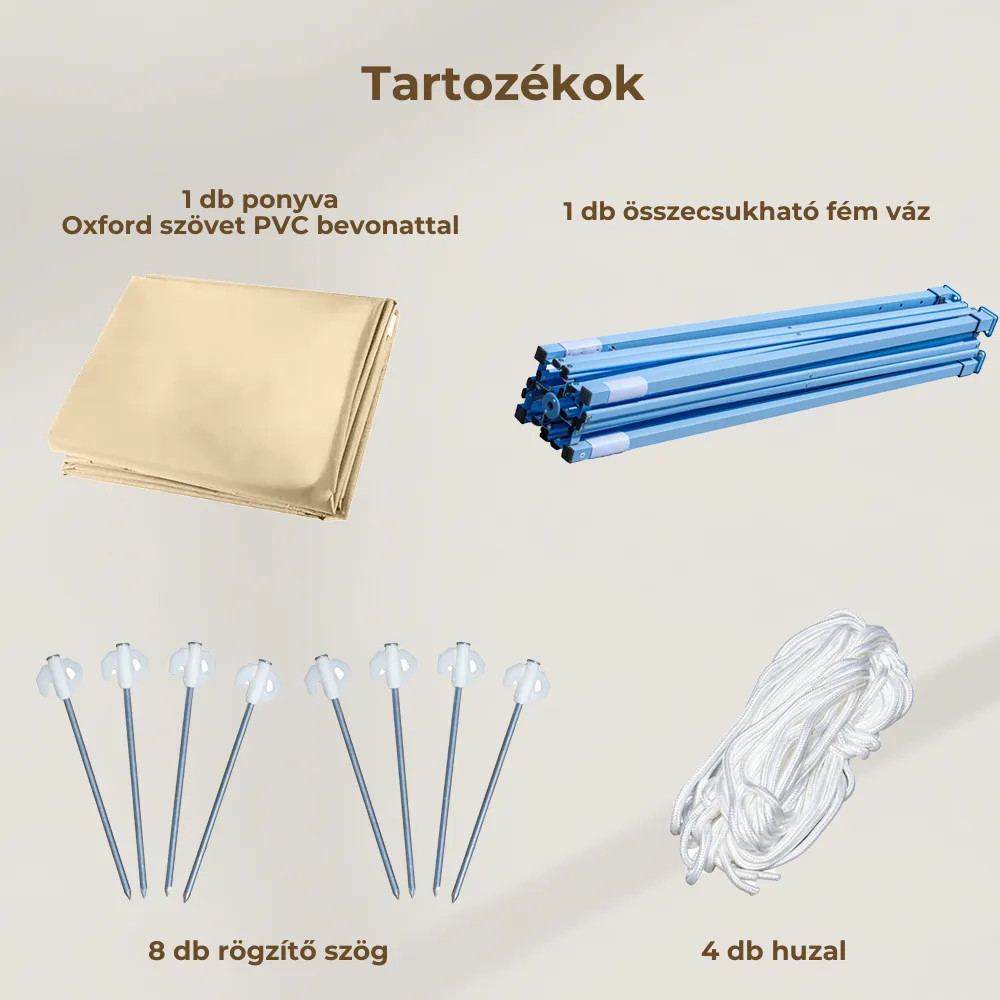• Accesorii: stabilitatea foișorului este asigurată de cercurile de la colțuri, de sârmele incluse și de țărușii de fixare. Pachetul include atât 4 sârme, cât și 4 cuie de fixare pentru a garanta o instalare sigură și stabilă.