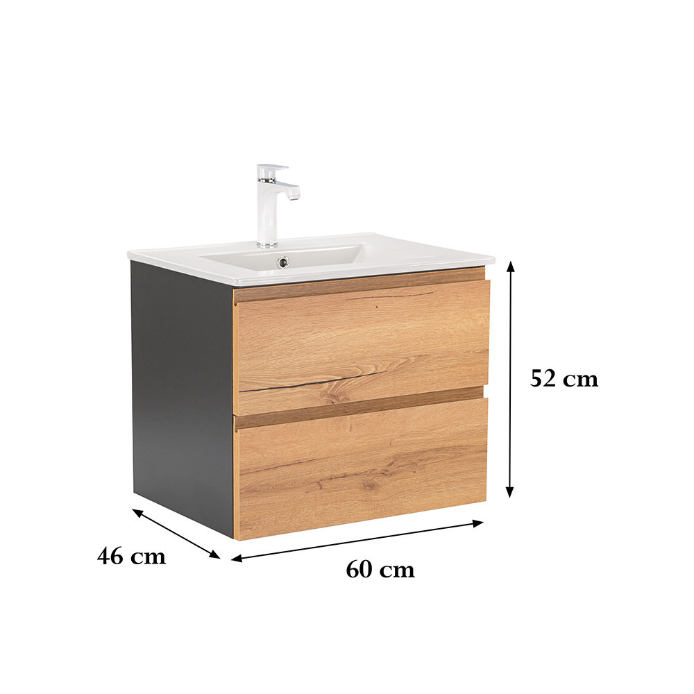Dulapul Vario Pull 60 cu chiuvetă este o alegere elegantă și practică pentru băile moderne. Dimensiunile sale compacte îl fac ideal pentru băile mici și medii, iar designul cu profil J din stejar antracit conferă spațiului un aspect elegant. Închiderea amortizată a sertarelor și designul suspendat oferă confort și curățare ușoară, în timp ce materialele de calitate asigură o durată lungă de viață.