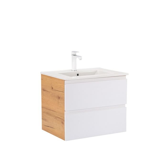 Dulapul Vario Pull 60 cu chiuvetă este o alegere elegantă și practică pentru băile moderne. Dimensiunile sale compacte îl fac ideal pentru băile mici și medii, iar designul din stejar și alb cu profil J conferă spațiului un aspect elegant. Închiderea amortizată a sertarelor și designul suspendat oferă confort și curățare ușoară, în timp ce materialele de calitate asigură durabilitate îndelungată.